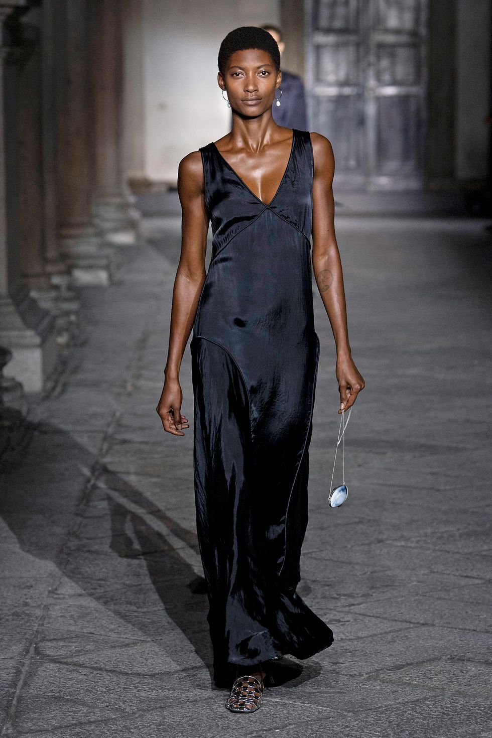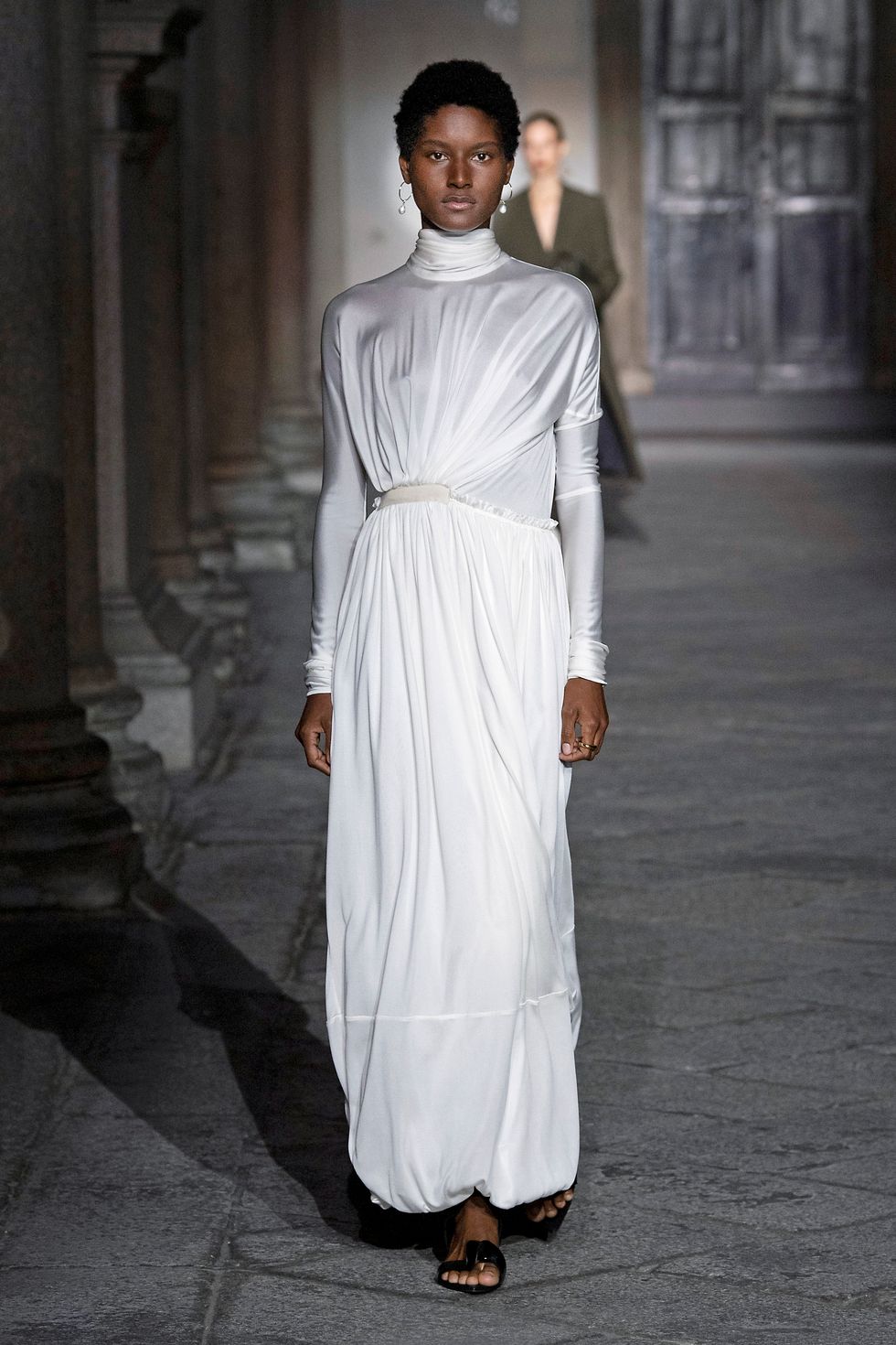 The brand's signature minimalist essence was still the basis of the collection, with a black and white palette seen on bias-cut dresses and fluid gowns.