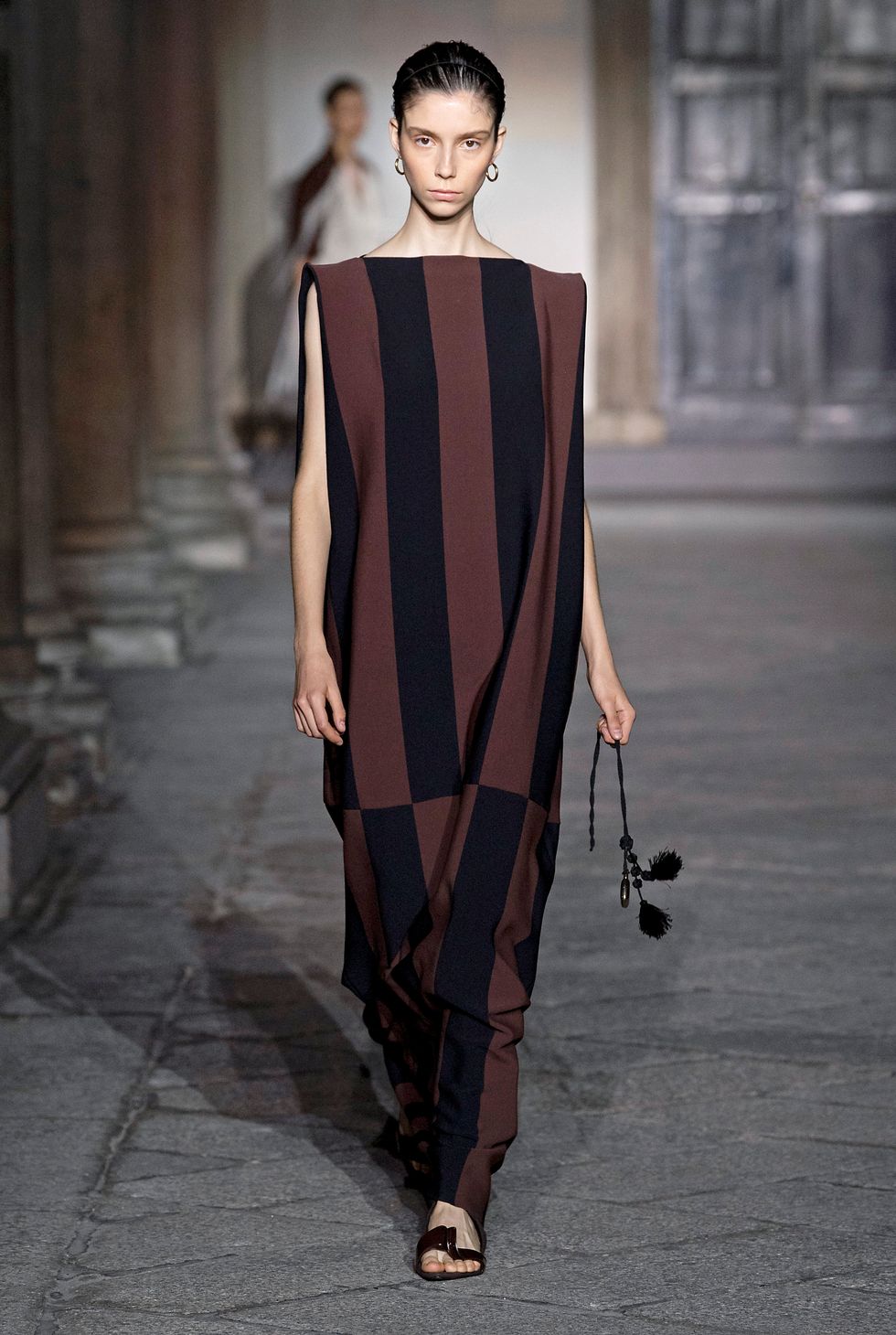 The crafty touch was also seen in patchwork patterns, but done in the Jil Sander way of smart precision and cut. Bold graphic lines (like the brown and black striped number) also counter-played the softer elements.