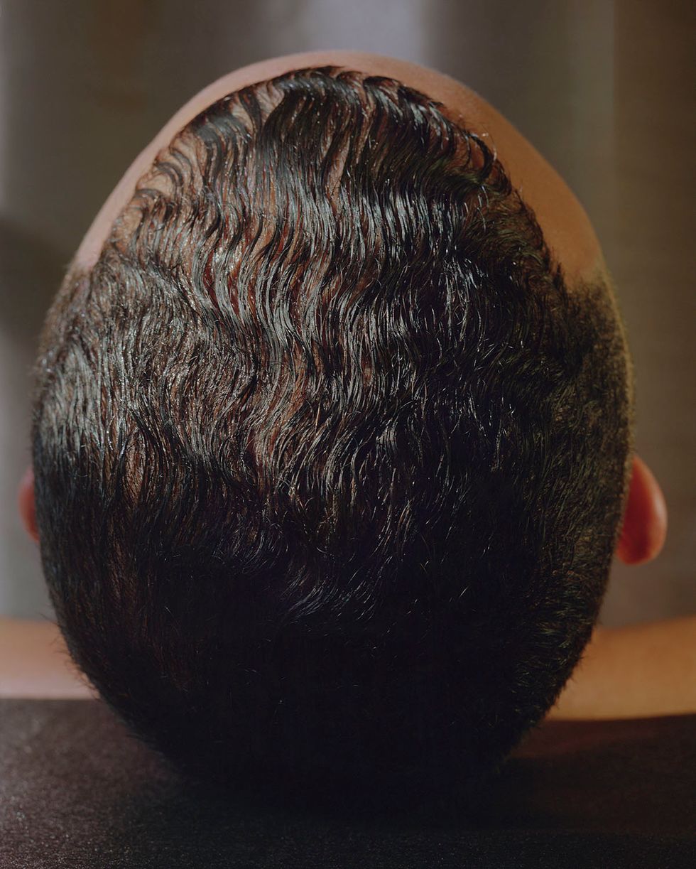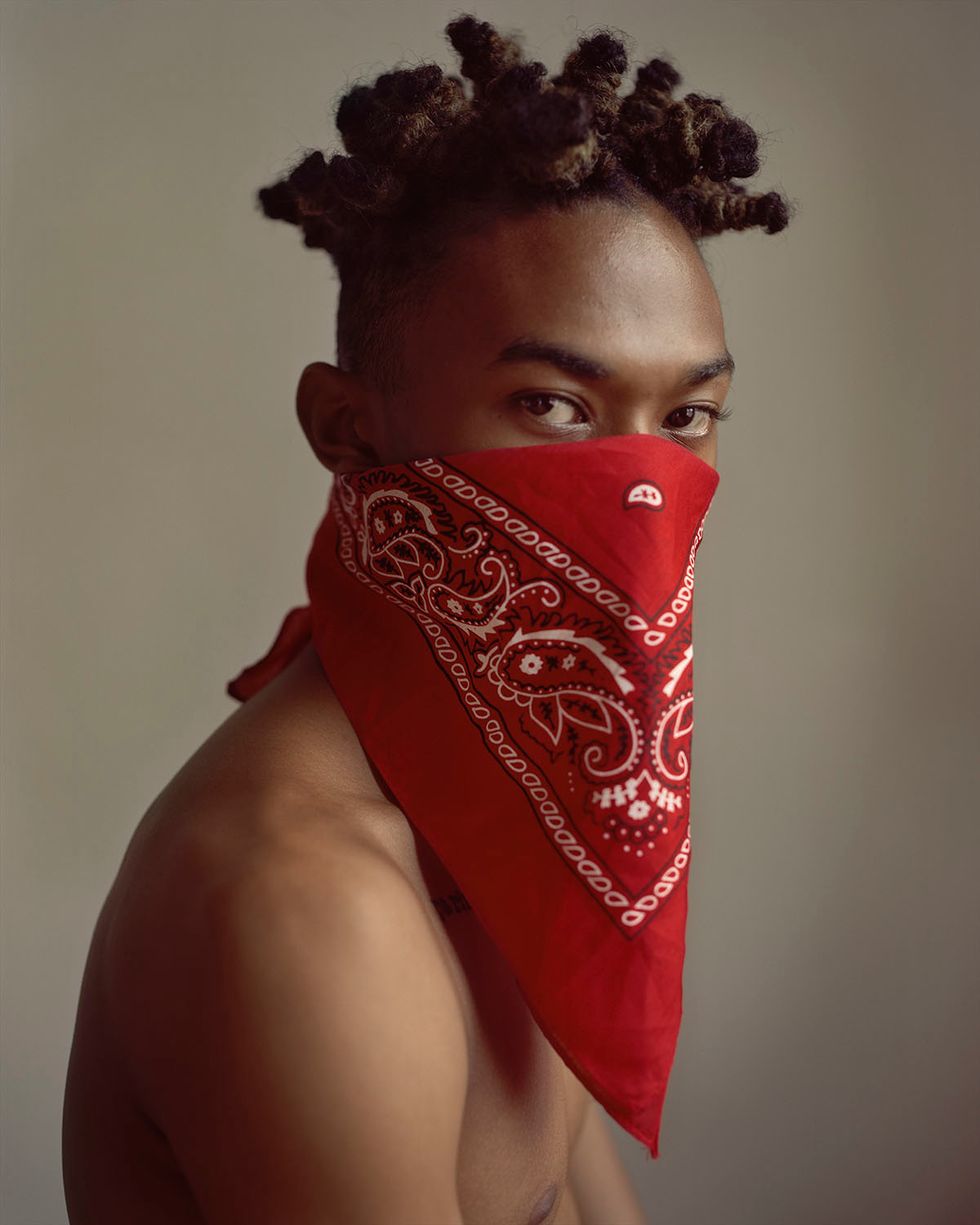 I'm really interested in the emotion of art. It's essential, and I think about how space within this exhibition, parses out emotionality. On one side of it, I have photographs that represent a type of submission and softness, and the opposite shows power and direct connection with viewer based on the gaze. The gaze in a lot of my work is about looking and being looked at. I collaborated with Malcolm Cuthbert, who is a hairstylist based here. He has been working on this project and was my muse for my do-rag images. A lot of my work is predicated on real-life experiences. So in a lot of ways, the people who are participants become collaborators. I always photograph actual models and I like to think that in the process of scouting people, one of the reasons it's called "Tribe," is because I'm building one.