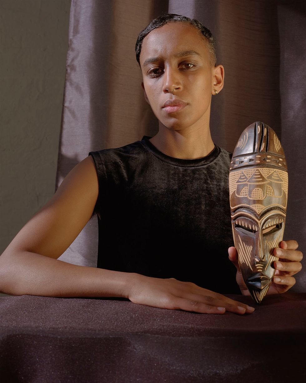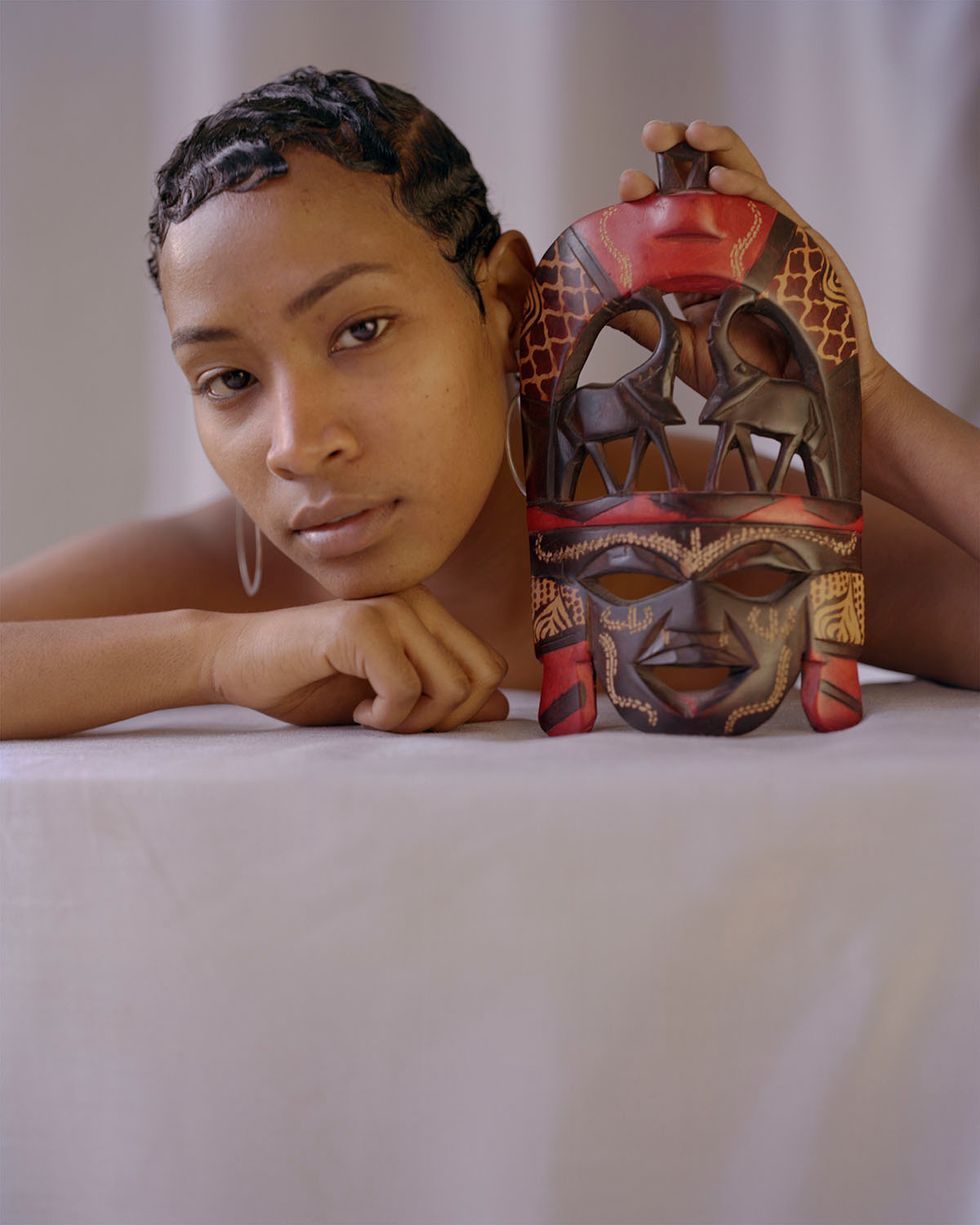 A very definitive moment for me in art-making in general was when I was in undergrad, and I was getting my BFA in fine art photography [at Washington DC's Corcoran School of the Arts and Design]. For me, I'm interested in blurred lines. Photography is a moving currency. When I was studying there, I saw the 30 Americans show from the Rubells' Family Collection. It was my first time seeing Black contemporary art. That for me was extremely liberating. We're at this point now where all these nuances of the Black experience are being unveiled, and that's obviously a great thing. But within art history and pop culture at large, there had been up until recently a monolithic portrayal of blackness. When I was the 30 Americans show, I saw the ways in which these Black artists talked about race and gender; about public and private, and how we come to frame history. A lot of the pictures in my show deal with history. I'm using these African decorative masks that are not specific to a tribe in Africa but are repurposed. One of my favorite pictures is of Alex, "His Strength." He's Haitian Creole. When you think of Haitian people and their physical features, Alex doesn't look like how you might "expect" him to look as a Haitian person. For me, the show poses these questions as to what makes something real or authentic. Also, the work, despite being politicized, it's always really appealed to queer people specifically because we know what it's like to have our authenticity questioned.