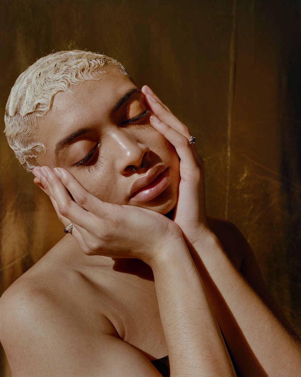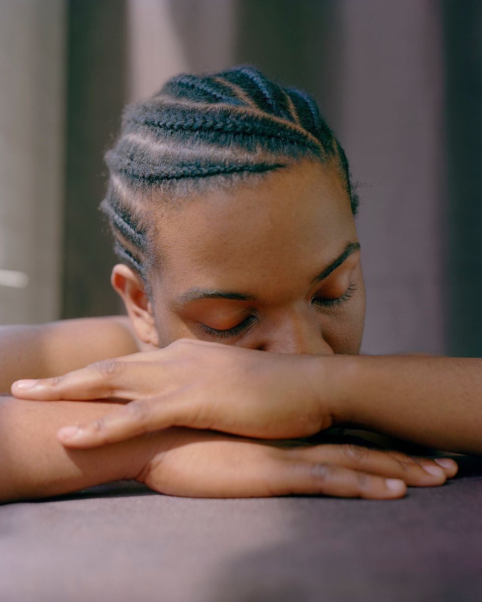 One of the works in "Tribe," Face As Mask II, Brittany is shown cradling her face, accented by dyed-blonde waves, created by Black hairstylist (and former Edmonds muse) Malcolm Cuthbert. In the portrait, Brittany's face seems almost detached from the body. "There is fluidity always, to how the body can be used," Edmonds says. "And to me, the waves in her hair give the photo overall a mermaid-like, aqueous quality. It's a deeply subjective thing, but it's how I see it."