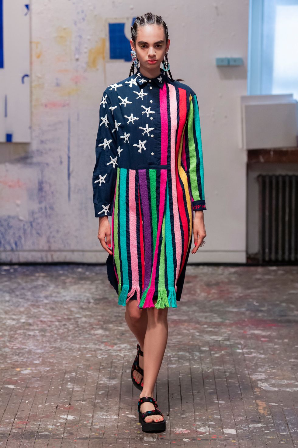 The image of the Mexican blanket manifested itself in the couple of looks in the collection. These crafty pieces, with their frayed edges and crafty rainbow stripes, were designed by artisans in Mexico City.