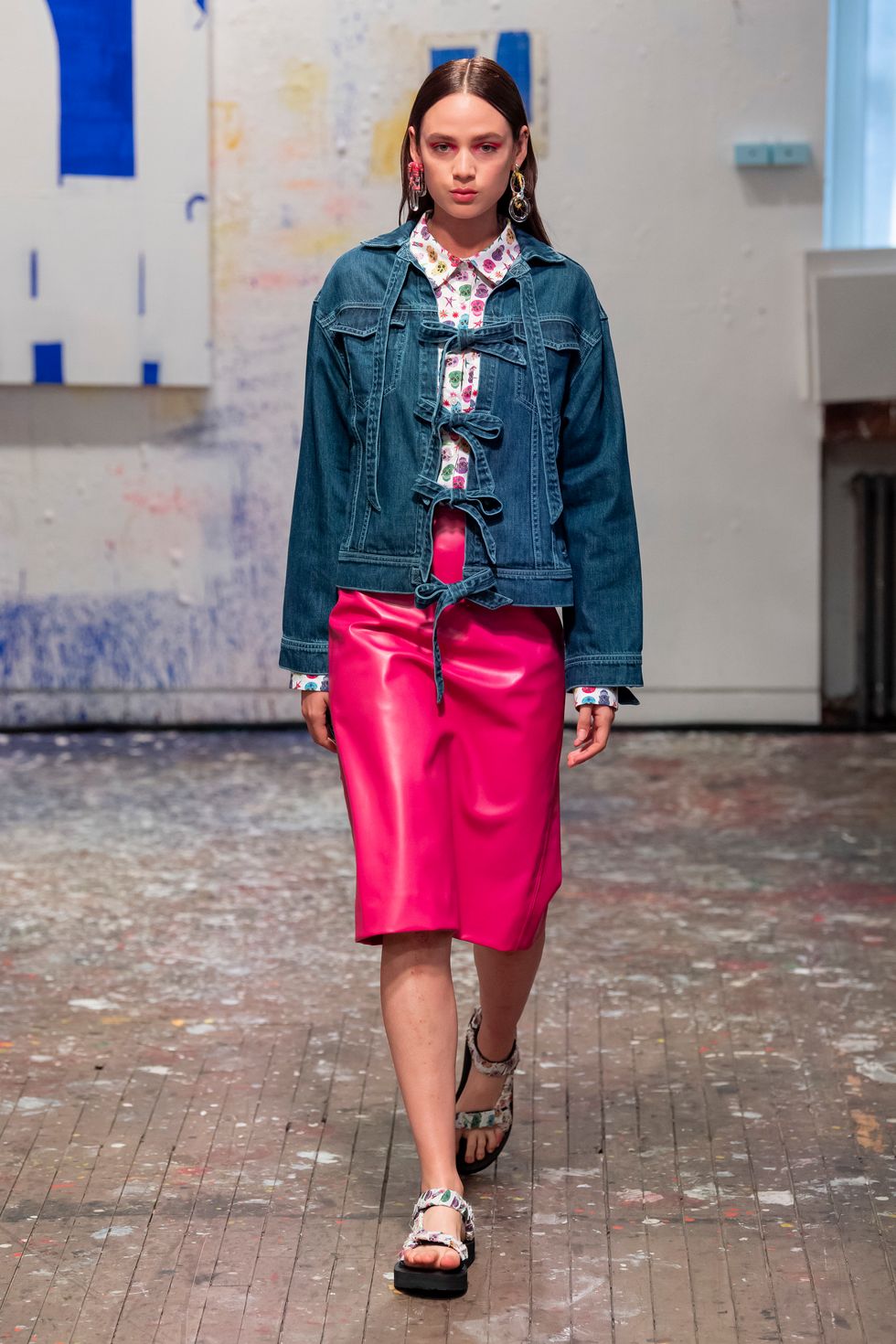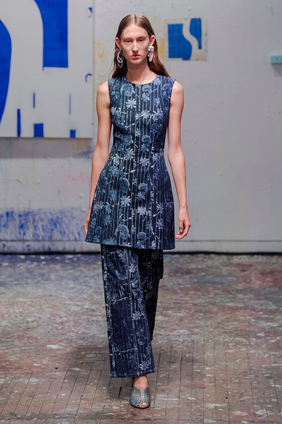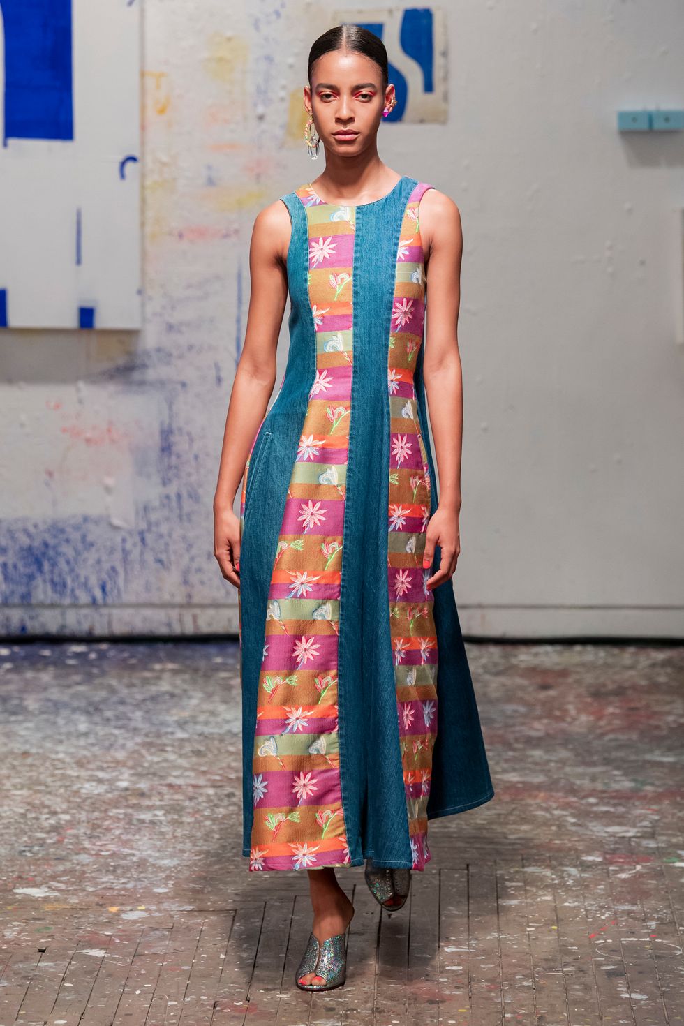 Cohen used organic cotton denim washed with non-toxic enzymes (the brand says they want to be continuously conscious of their environmental impact). These were utilized in paneled midi-dresses, patchwork denim pants, and jean jackets.