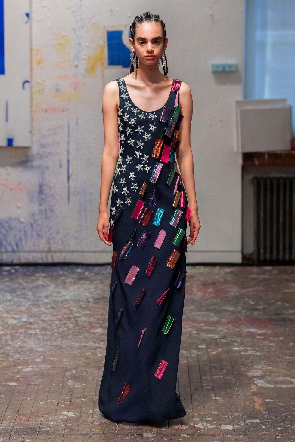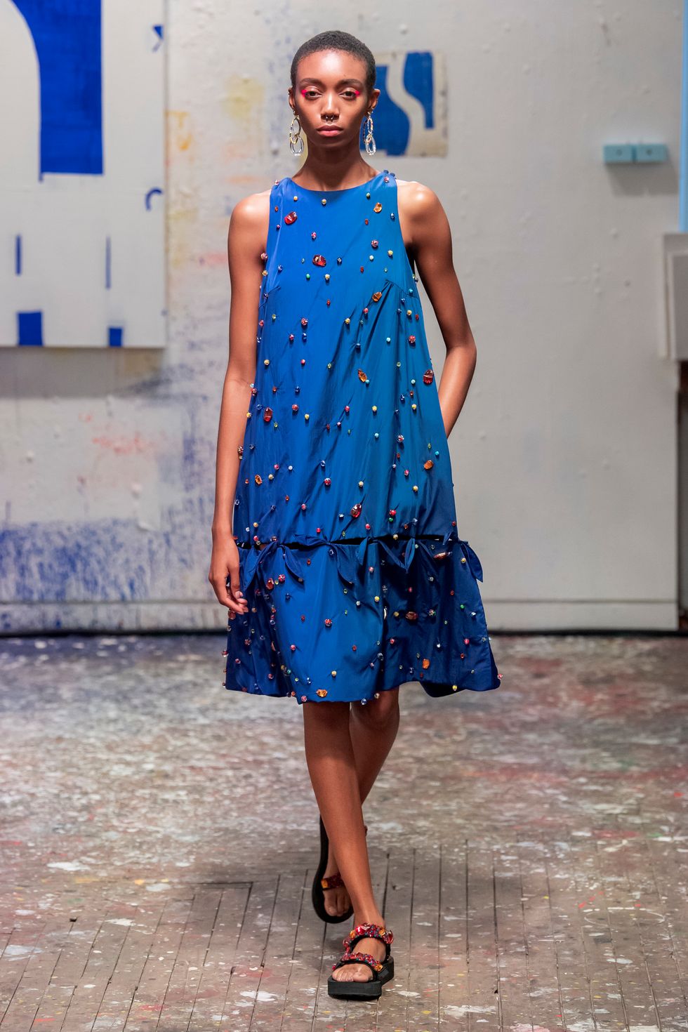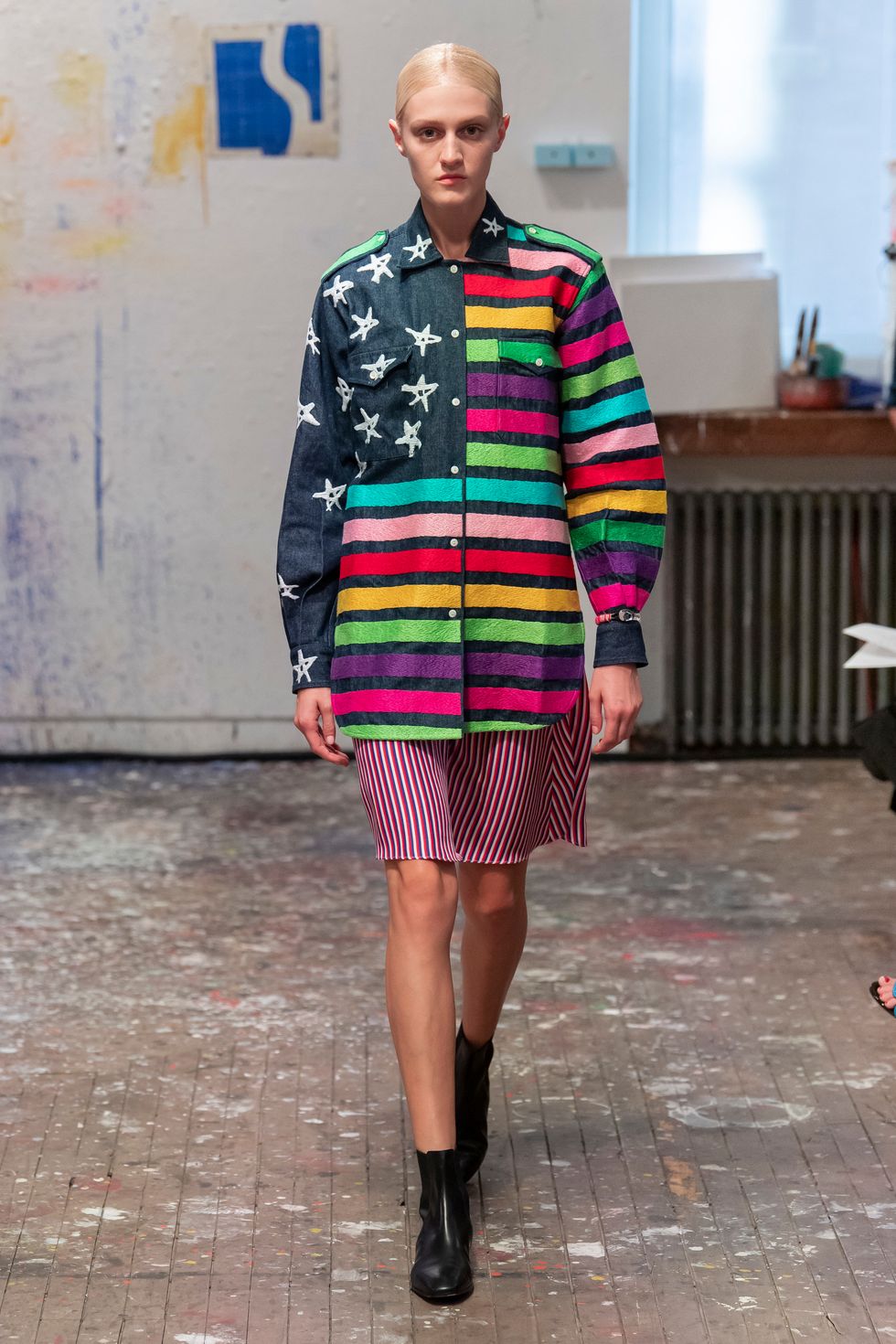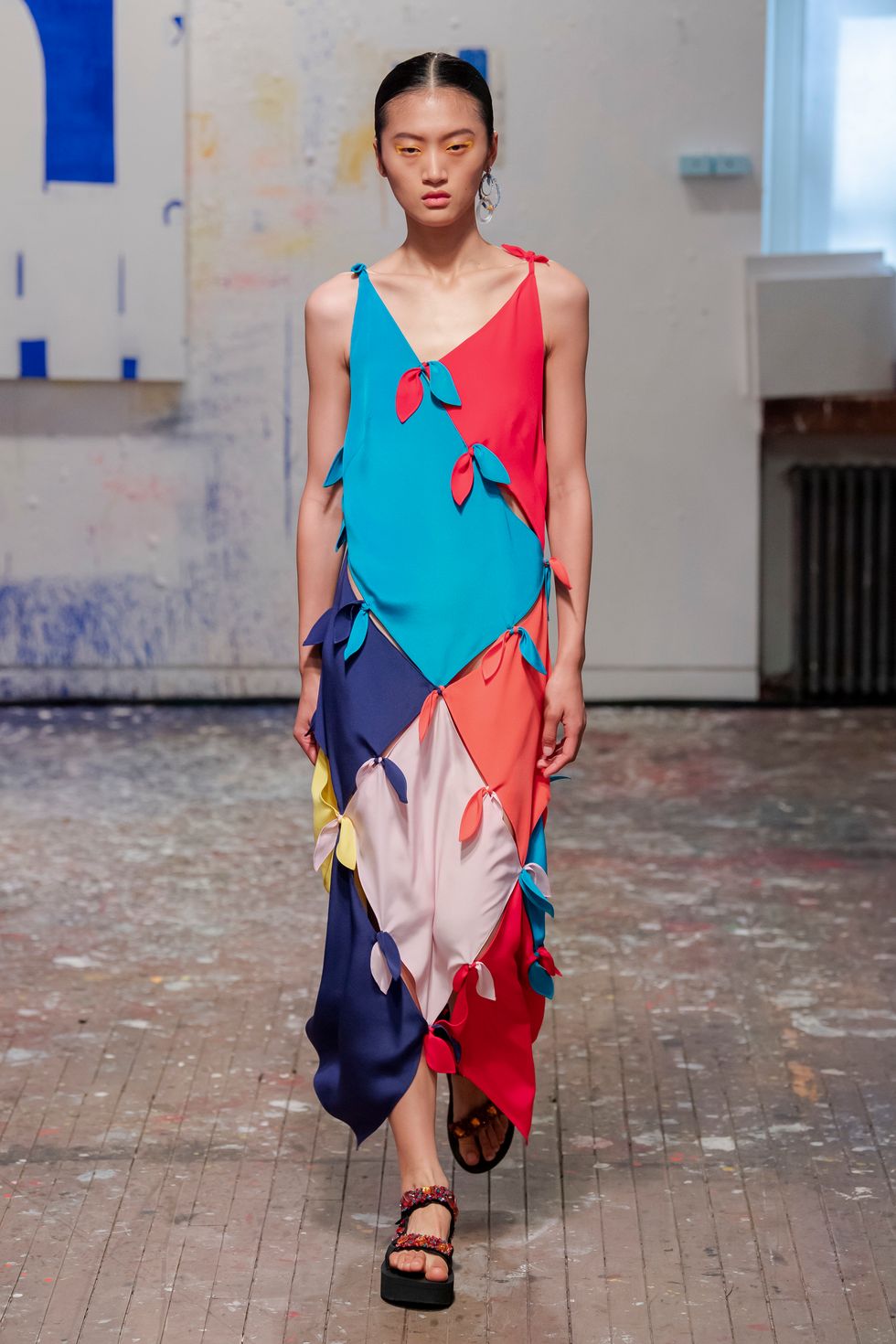 Cohen used organic cotton denim washed with non-toxic enzymes (the brand says they want to be continuously conscious of their environmental impact). These were utilized in paneled midi-dresses, patchwork denim pants, and jean jackets.