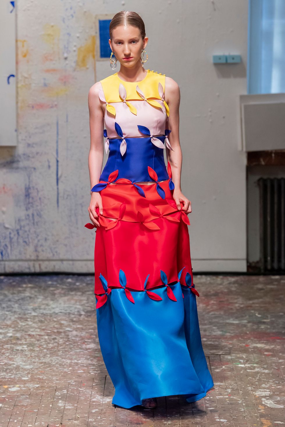 Pieces and panels of dresses and other garments were tried together to form exaggerated knots. Some of the looks utilized these techniques to form a cascading, tiered effect.
