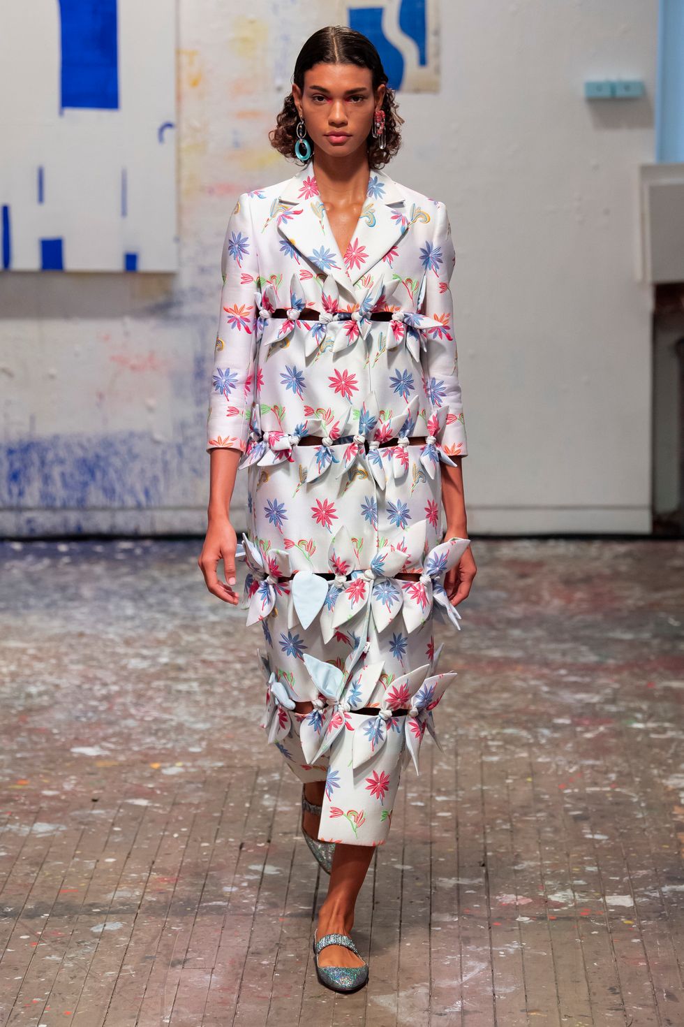 The starting point for Jonathan Cohen's Spring 2020 collection began with an image of a traditional Mexican serape blanket made to resemble an American flag, but with multicolored rainbow stripes. Cohen, whose family is originally from Mexico City, said in his show notes that while growing up, the line between Tijuana and his hometown of San Diego just didn't exist. His collection, then, serves as an expression of "oneness" and a "borderless existence," concepts readily noticeable in crafty hand-drawn Dia de los Muertos skulls and crocheted knits. His childhood summers in Acapulco and teenage years in La Jolla are also evident in longboard-shaped embroideries and a California grizzly bear. In light of our politically-fraught times, this collection felt deeply authentic and personal. Floral arrangements and a live vocalist playing the piano in the intimate studio of artist Caio Fonseca made it all the more special. Here's everything else you need to know about the collection.