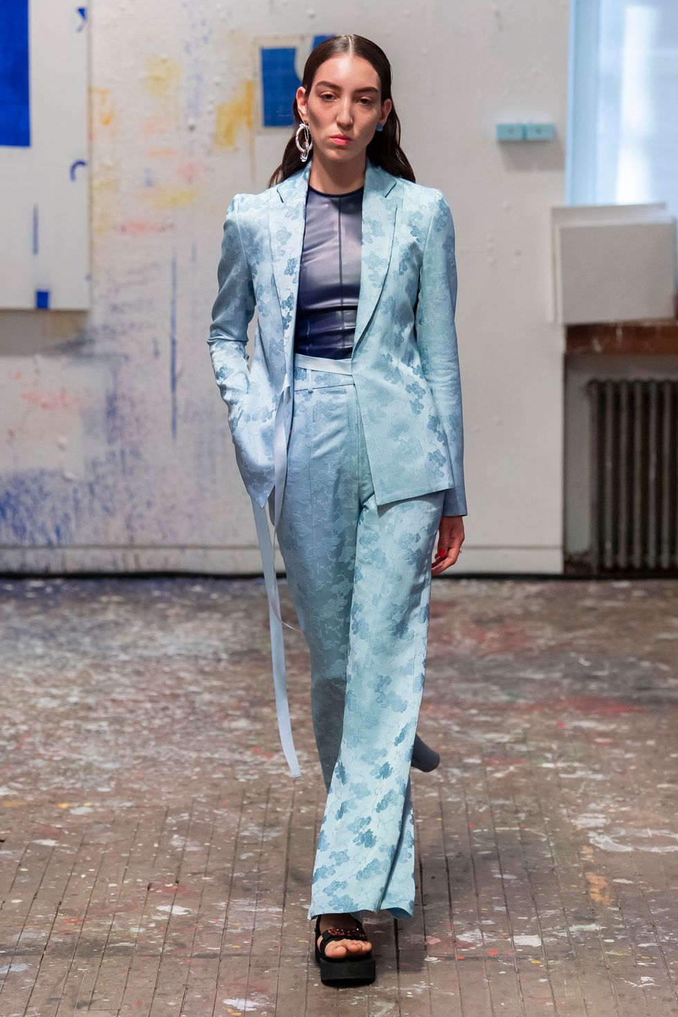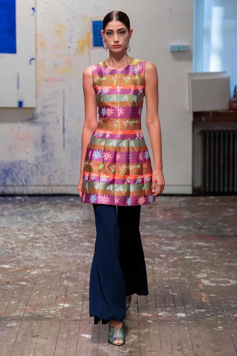 Hourglass tunic tops, trousers and suits were weaved in floral jacquard patterns. The multicolored stripes and shades of blue looks resplendent against the modest silhouettes.