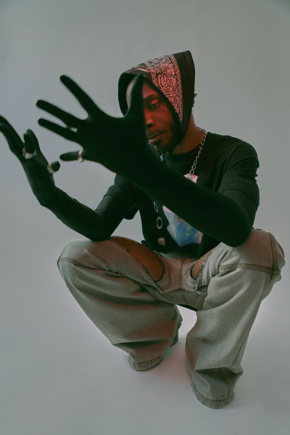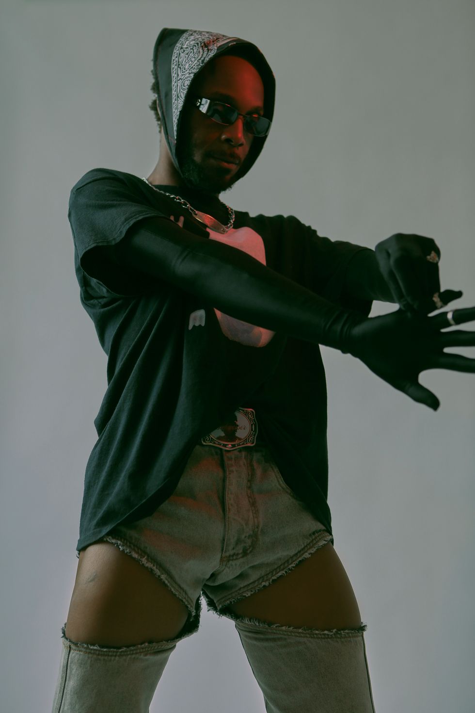 Top: Thoom, Pants: Telfar, Gloves: Shay Gallagher, Bandana: Vincent Guerrero, Rings: Anointed Vintage