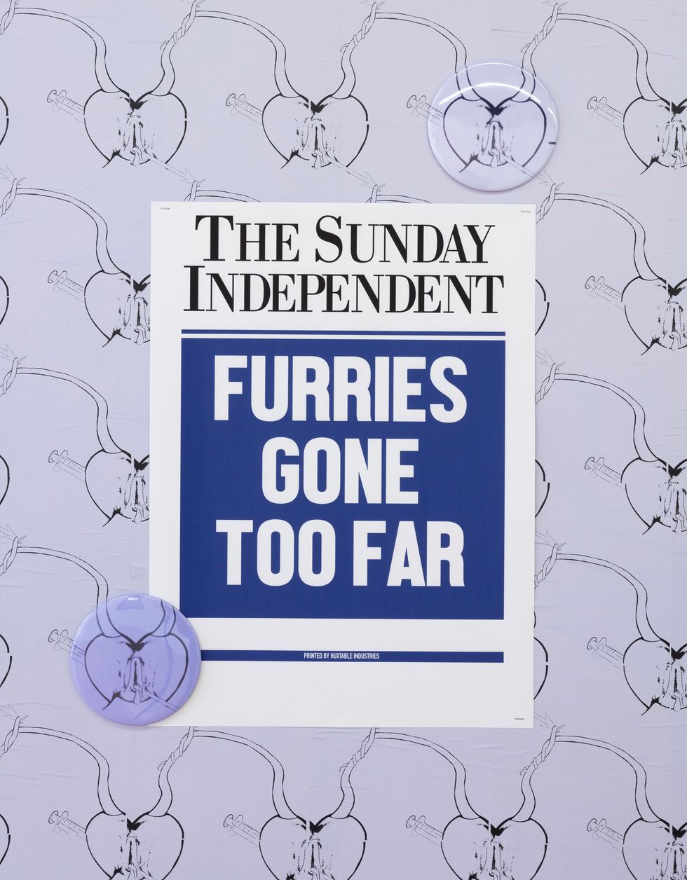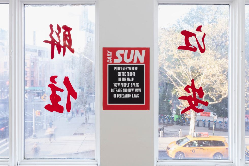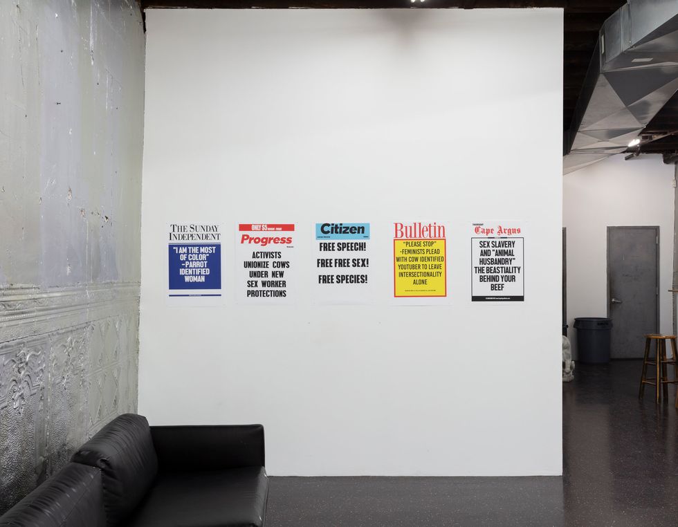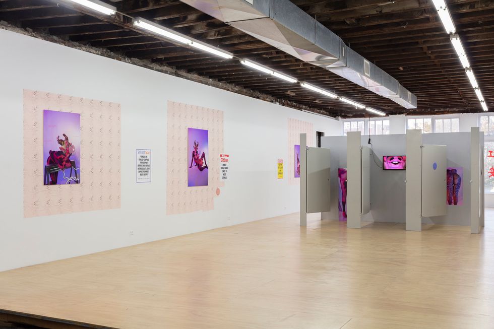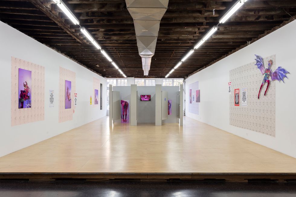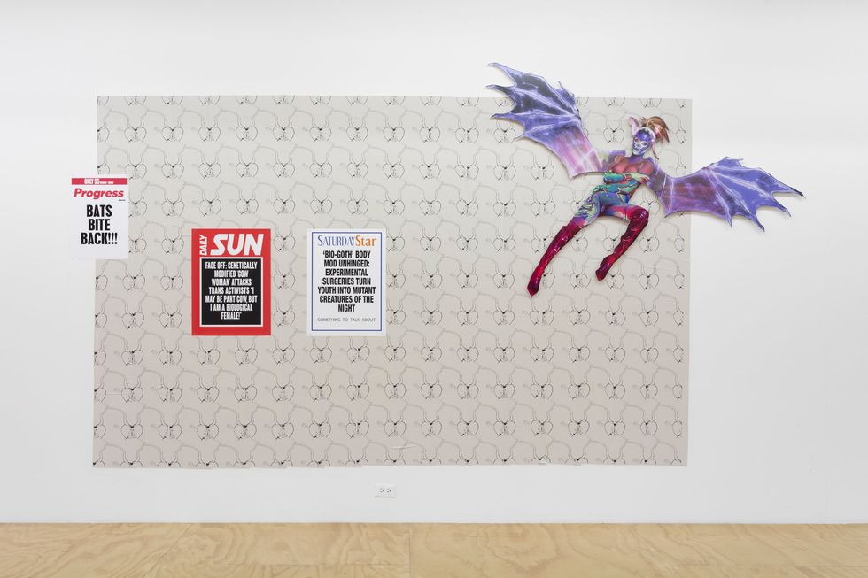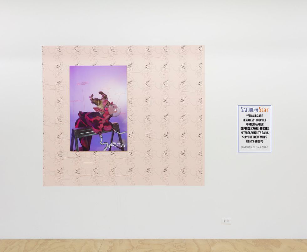 The images featured in the show riff on Huxtable's relationship to bodies as interspecies objects, and the tabloid headlines she creates are juxtaposed with these images, serving as powerful commentary on media shock tactics meant for maximum consumption. In various metallic neon portraits, Huxtable plays subservient cow-people or dominant bat-demons, both wily violators of man-made "laws" of nature. "Complexes" of these images are set up among public bathroom stalls and at-home wallpaper motifs.