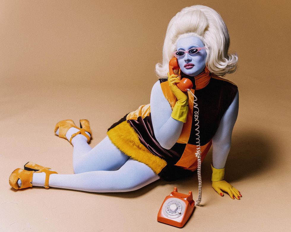 She'd already been painting herself blue, calling herself "something of a club kid" before she first tried drag in a Manchester club in 2018. Birch manifested her drag persona out of her clay work, taking her mid-century galactic housewife cues from Tim Burton's creations of Miss Argentina from Beetlejuice and the Martian Girl from Mars Attacks! But Birch's mid-century modern take is one of misplaced glamour; her origin story has her dropped on Earth in an eternal 1962, where she immediately adopts a kitchen-chic kitsch vibe, complete with cow-print aprons and turquoise rubber gloves with the nails painted blood red.