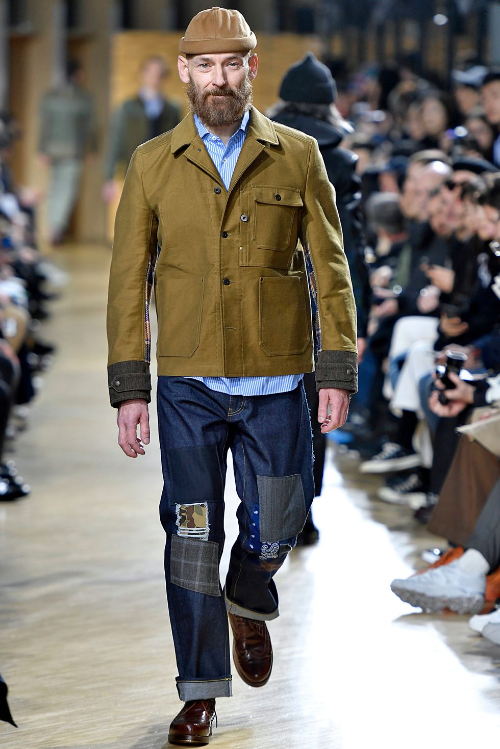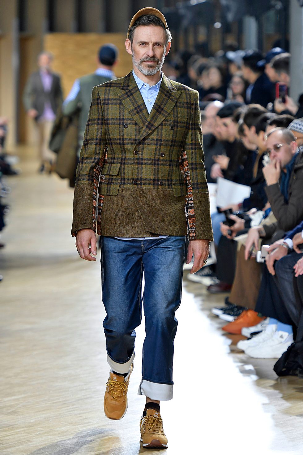 So there were visible stockings and polka-dot socks for the cool dad-lover in you, paired with a tapered, flared trouser or denim with patchwork trimming or detailing. And New Balance trainers here or there. The ugly-on-purpose kind that, yes, dads the world over tend to wear when being tourists or going for morning walks. And as if in on a joke, which, knowing the Watanabe legacy of irreverence, dad-friendly hats also adorned the scalps of our next men's calendar: Curved brims and newsie caps and beanies and all.