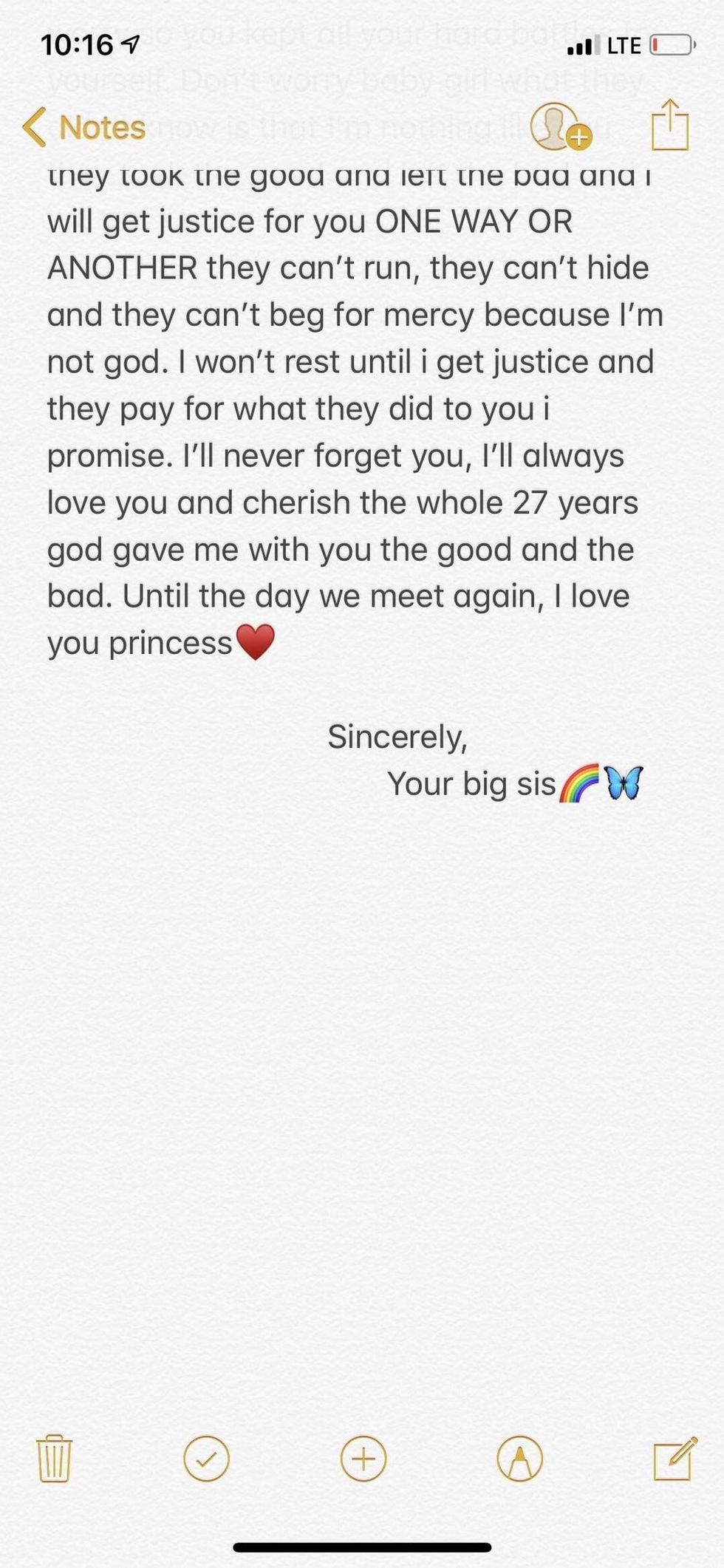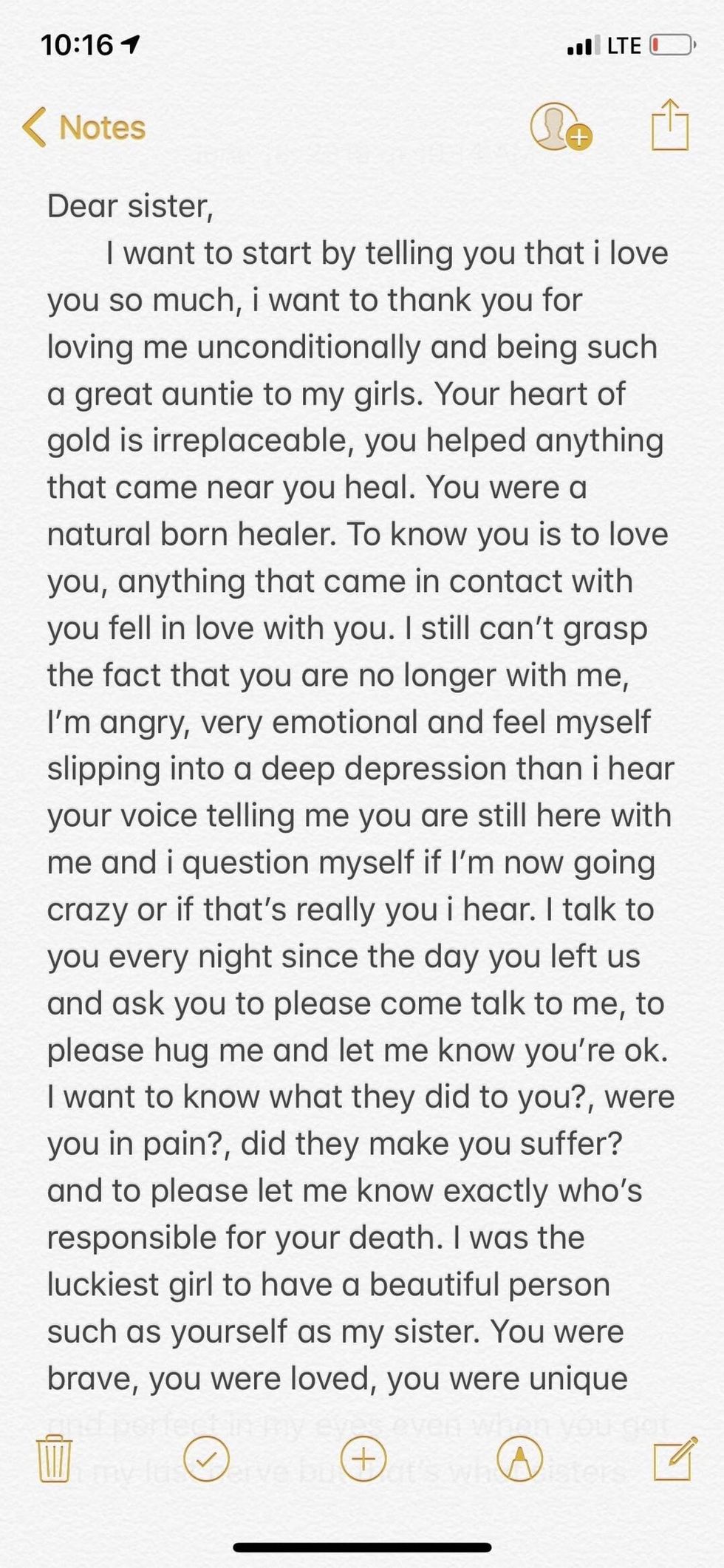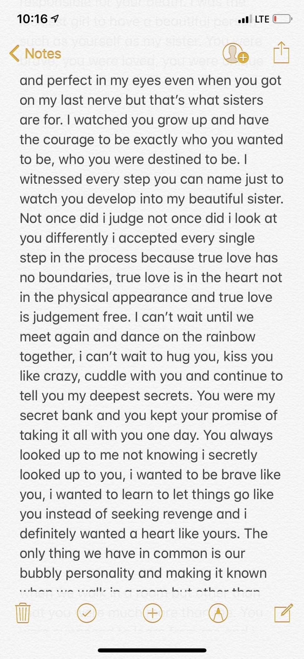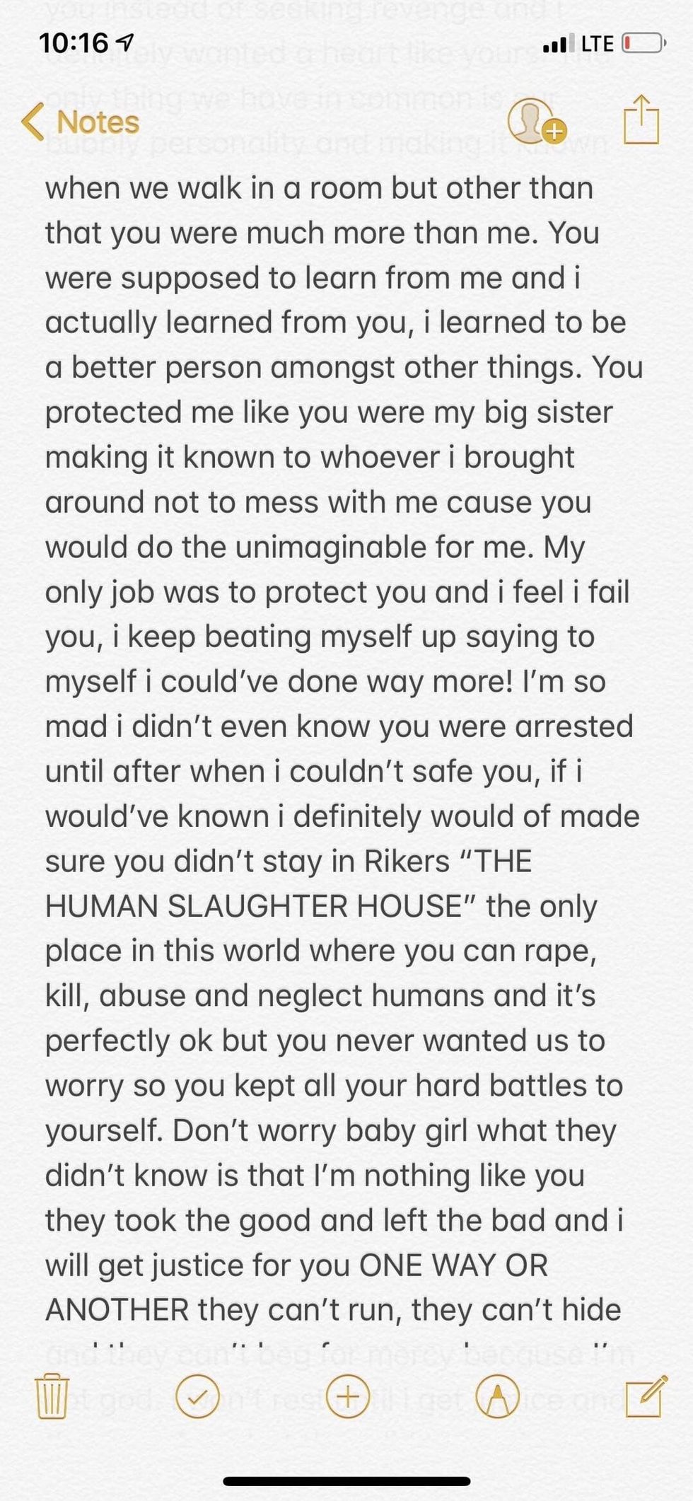 I want to start by telling you that I love you so much, I want to thank you for loving me unconditionally and being such a great auntie to my girls. Your heart of gold is irreplaceable, you helped anything that came near you heal. You were a natural born healer. To know you is to love you, anything that came in contact with you fell in love with you. I still can't grasp the fact that you are no longer with me, I'm angry, very emotional and feel myself slipping into a deep depression than I hear your voice telling me you are still here with me and I question myself if I'm now going crazy or if that's really you I hear. I talk to you every night since the day you left us and ask you to please come talk to me, to please hug me and let me know you're ok. I want to know what they did to you?, Were you in pain?, Did they make you suffer? And to please let me know exactly who's responsible for your death. I was the luckiest girl to have a beautiful person such as yourself as my sister. You were brave, you were loved, you were unique and perfect in my eyes even when you got on my last nerve but that's what sisters are for. I watched you grow up and have the courage to be exactly who you wanted to be, who you were destined to be. I witnessed every step you can name just to watch you develop into my beautiful sister. Not once did I judge not once did I look at you differently I accepted every single step in the process because true love has no boundaries, true love is in the heart not in the physical appearance and true love is judgement free. I can't wait to hug you, kiss you like crazy, cuddle with you and continue to tell you my deepest secrets. You were my secret bank and you kept your promise of taking it all with you one day. You always looked up to me not knowing I secretly looked up to you, I wanted to be brave like you, I wanted to learn to let things go like you instead of seeking revenge and I definitely wanted a heart like yours. The only thing we have in common is our bubbly personality and making it known when we walk in a room but other than that you were much more than me. You were supposed to learn from me and I actually learned from you, I learned to be a better person amongst other things. You protected me like you were my big sister making it known to whoever I brought around not to mess with me cause you would do the unimaginable for me. My only job was to protect you and I feel I fail you, I keep beating myself up saying to myself I could've done way more! I'm so mad I didn't even know you were arrested until after when I couldn't safe you, if I would've known I definitely would of made sure you didn't stay in Rikers "THE HUMAN SLAUGHTER HOUSE" the only place in the world where you can rape, kill, abuse and neglect humans and it's perfectly ok but you never wanted us to worry so you kept all your hard battles to yourself. Don't worry baby girl what they didn't know is that I'm nothing like you they took the good one and left the bad and I will get justice for you ONE WAY OR ANOTHER they can't run, they can't hide and they can't beg for mercy because I'm not god. I won't rest until I get justice and they pay for what they did to you I promise. I'll never forget you, I'll always love you and cherish the whole 27 years god gave me with you the good and the bad. Until the day we meet again, I love you princess