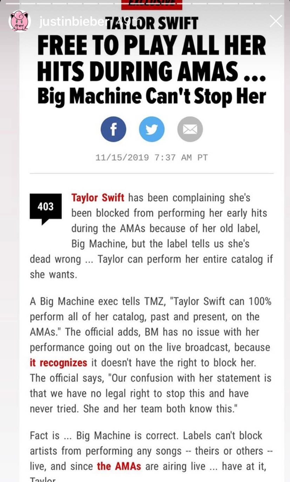Bieber then addressed the issue with a screenshot of a TMZ article with a headline that reads, "TAYLOR SWIFT FREE TO PLAY ALL HER HITS DURING AMAS...Big Machine Can't Stop Her." The article quotes the label saying that Swift is free to perform her any of her songs at any time, echoing the label’s official statement.