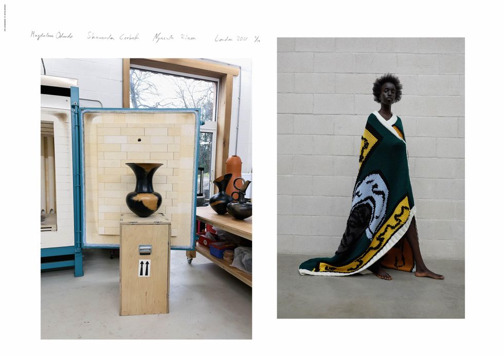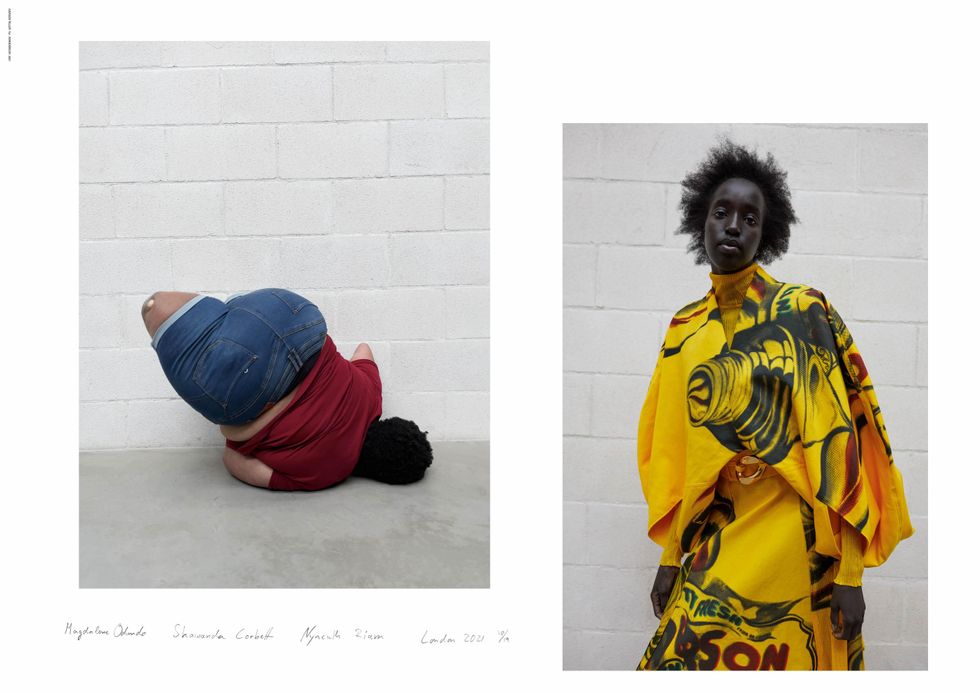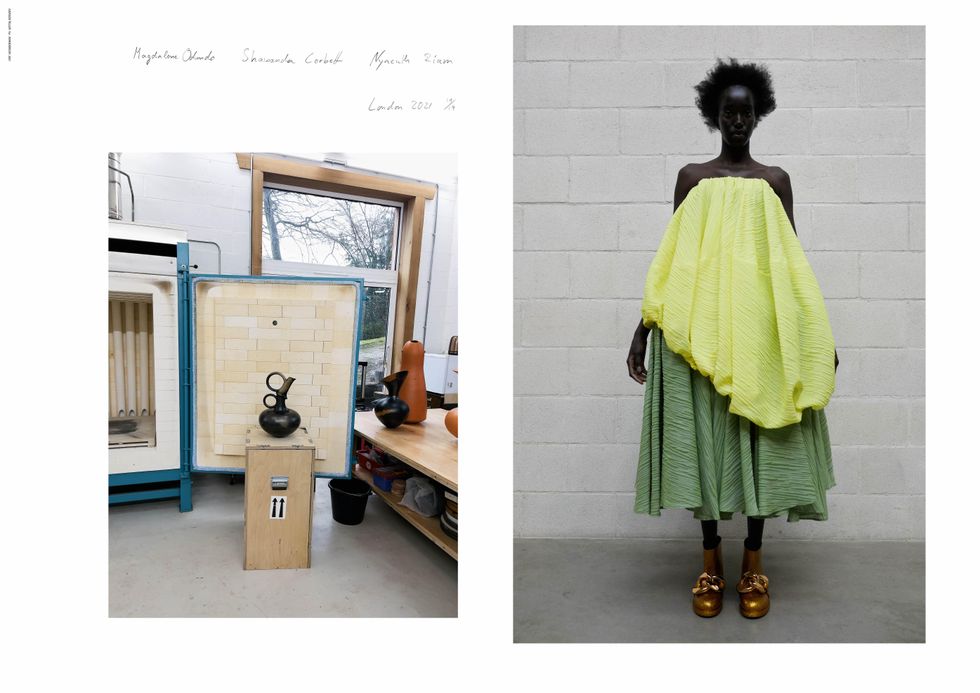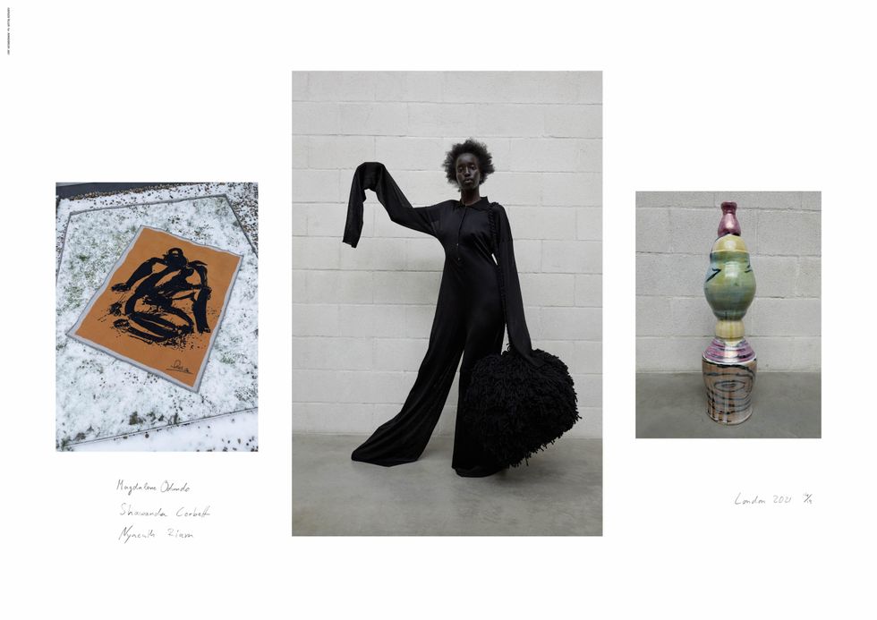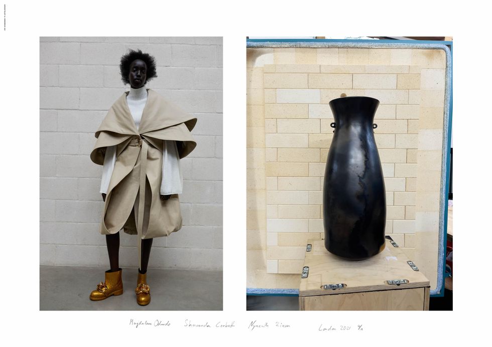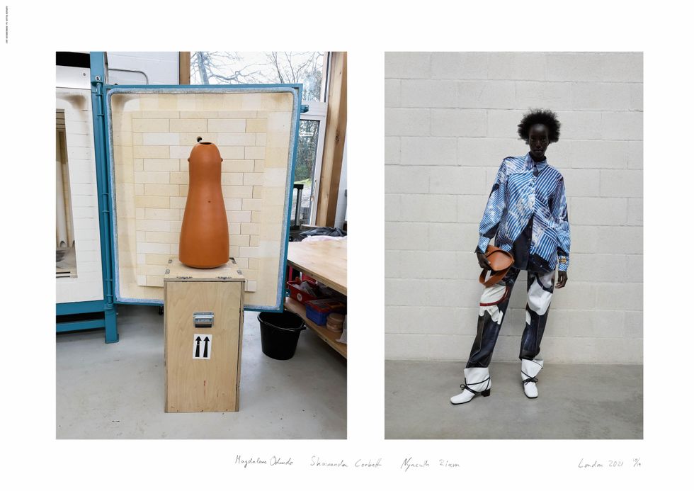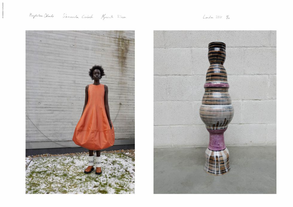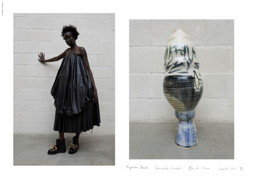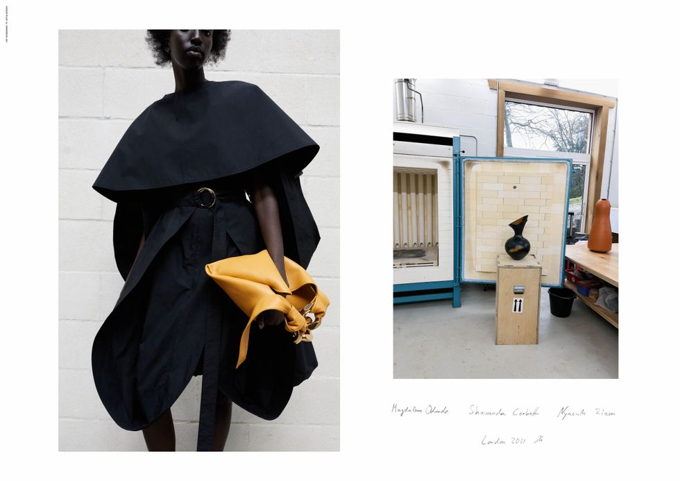 Teller's hyper-real, snapshot style aesthetic was a big draw for Anderson, who wanted the lookbook this season to be stripped down and focused on the abnormal silhouettes and elongated volumes of his latest collection. The amorphous shapes and unfolding jackets were inspired by the ceramic works of pioneering artists Magdalene Odundo and Shawanda Corbett, who Teller also shot for the lookbook.