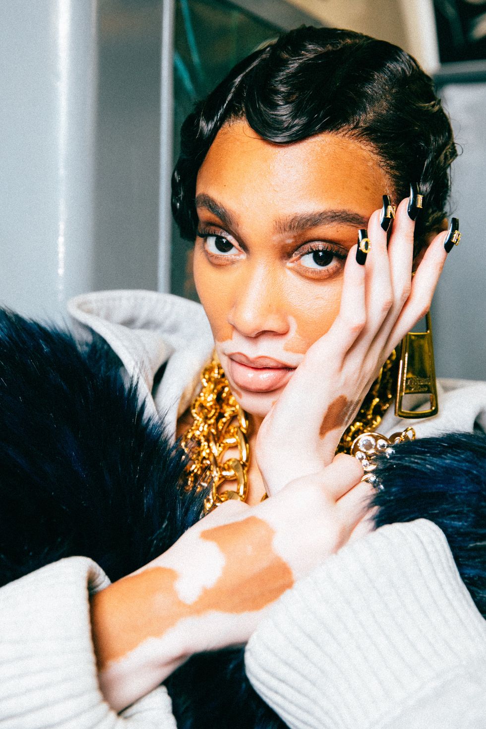 Scott's well-established "rebel" status in fashion was further enhanced by Moschino's makeup. "It's a very tough look," Kabuki said. "It was inspired by gangs and it's almost a rebellious look [with] the black lip liner, but I'm handling it in a way of complete anal retentive perfection and beauty with no hair out of place. [There were] a lot of natural beauty tricks to make the models look immaculate, so that it really comes across as a very polished desirable look."