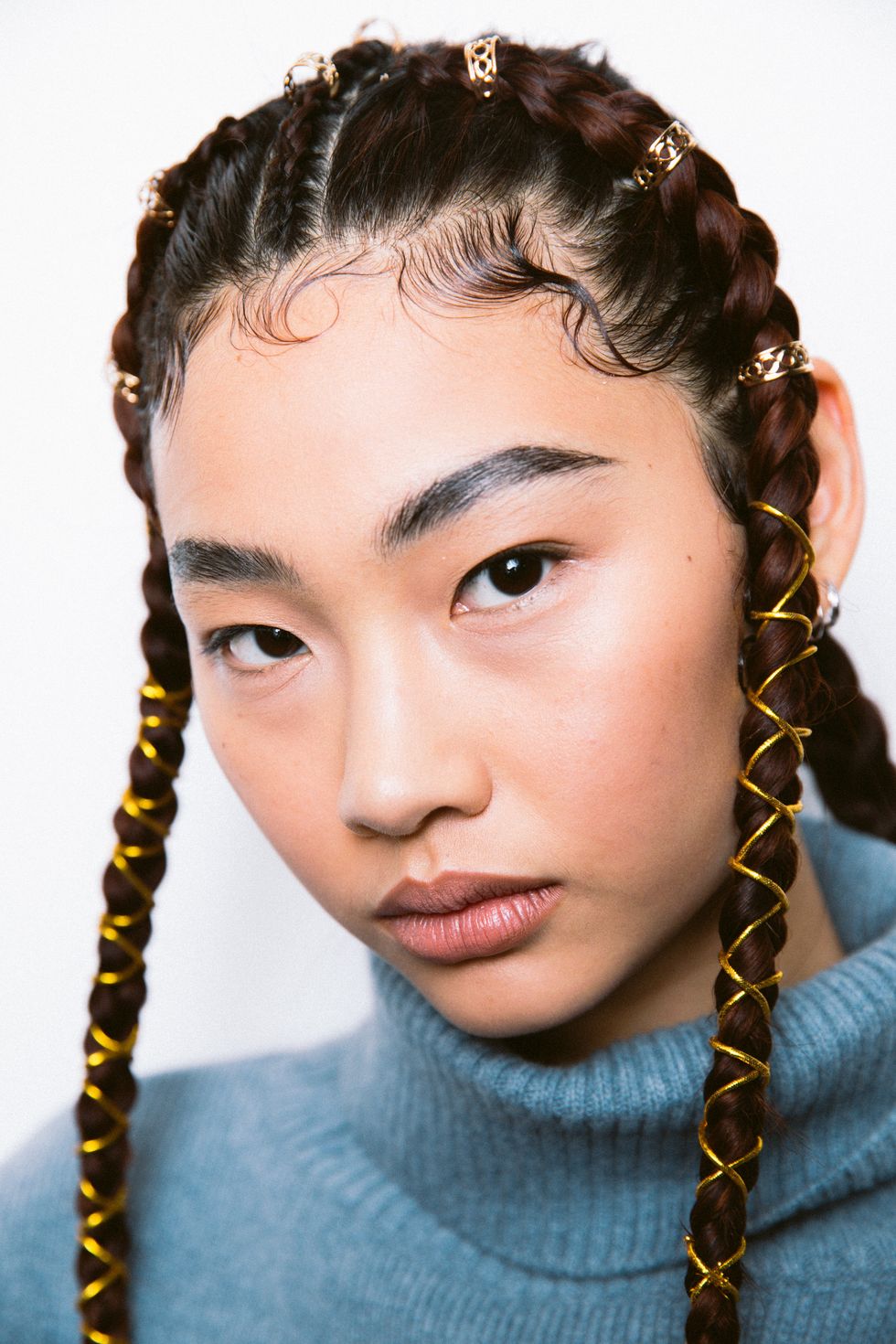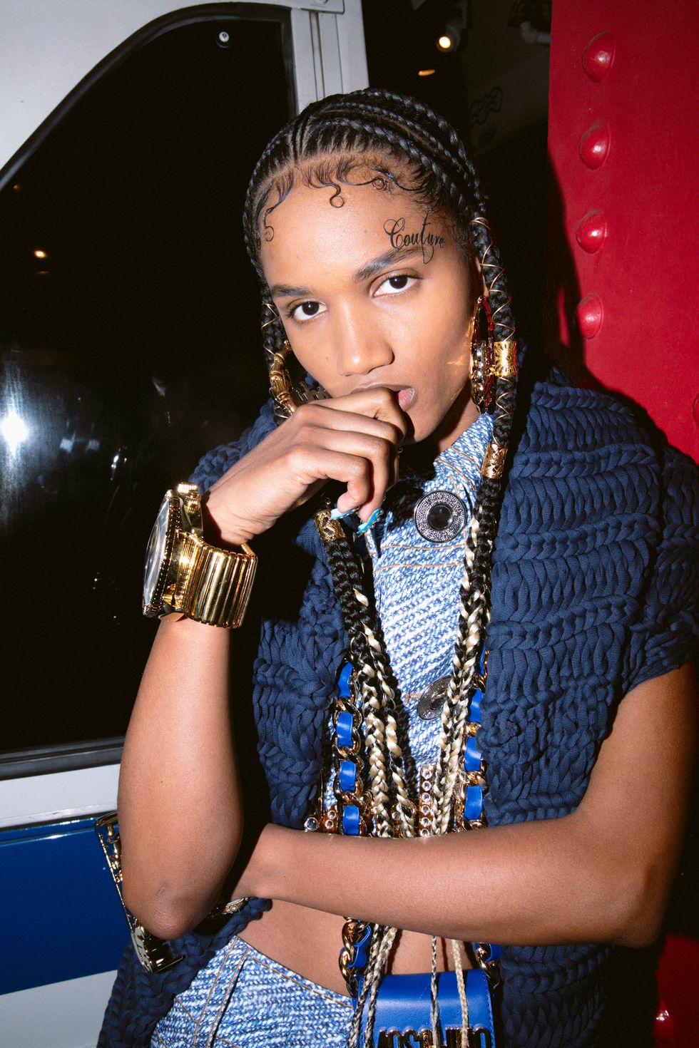 Over in the beauty department, a string of hair stylists, makeup and tattoo artists all collaborated to create looks to complement the theme. Japanese nail artist Mei Kawajiri crafted more than 1,200 nail tips by adding cut gold chains, silver metal hoops, and the words "Moschino" in glimmering letters. Hair stylist Jimmy Paul whipped up a range of retro styles such as braids, finger waves, and trimmed bangs topped with gold metallic spray.