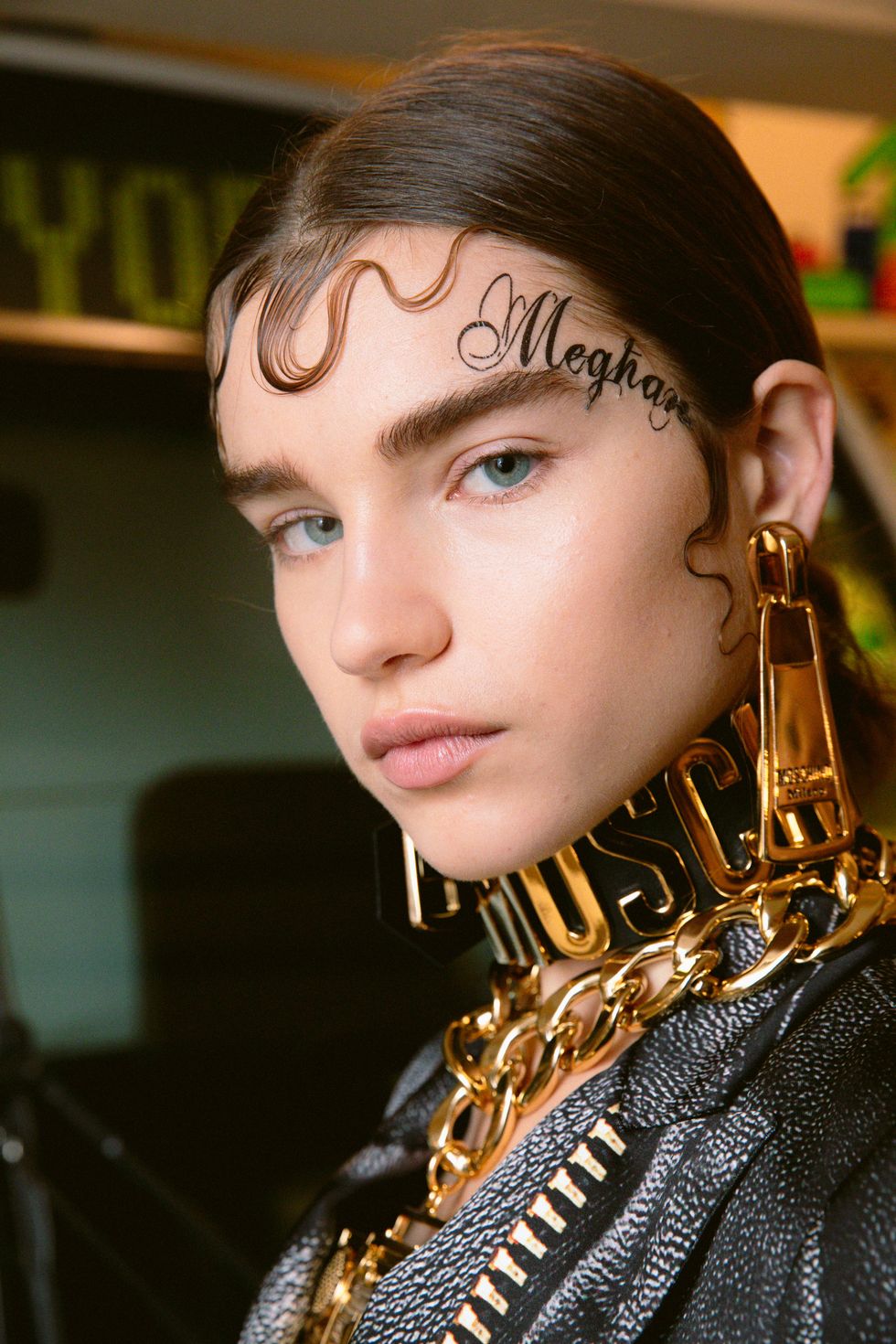 Legendary makeup artist and frequent Moschino collaborator Kabuki was tasked with putting together and directing the makeup looks for the night. In collaboration with tattoo artist JonBoy, the duo calligraphed temporary face tattoos with the words "Moschino" and "New York" pasted across models' foreheads.