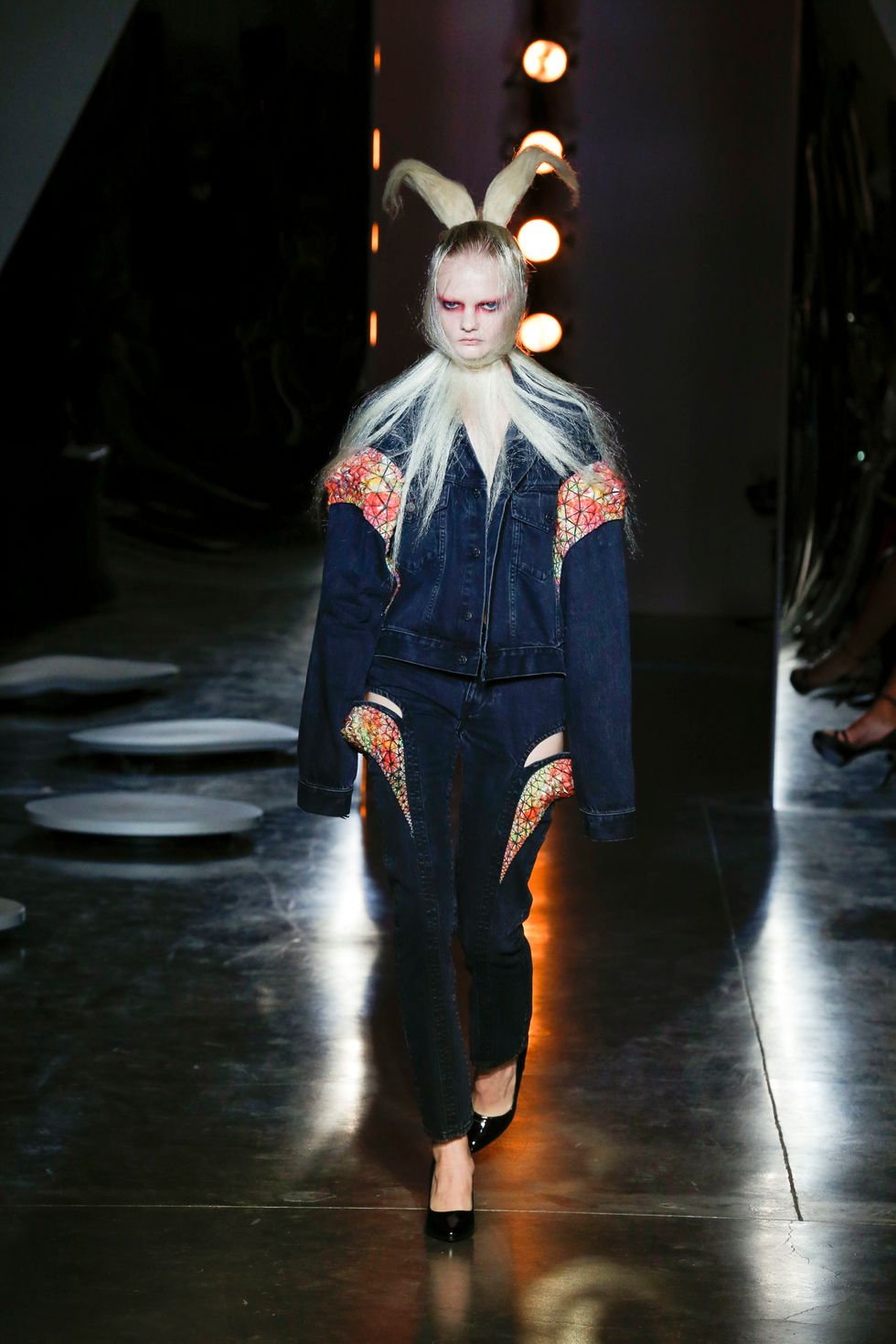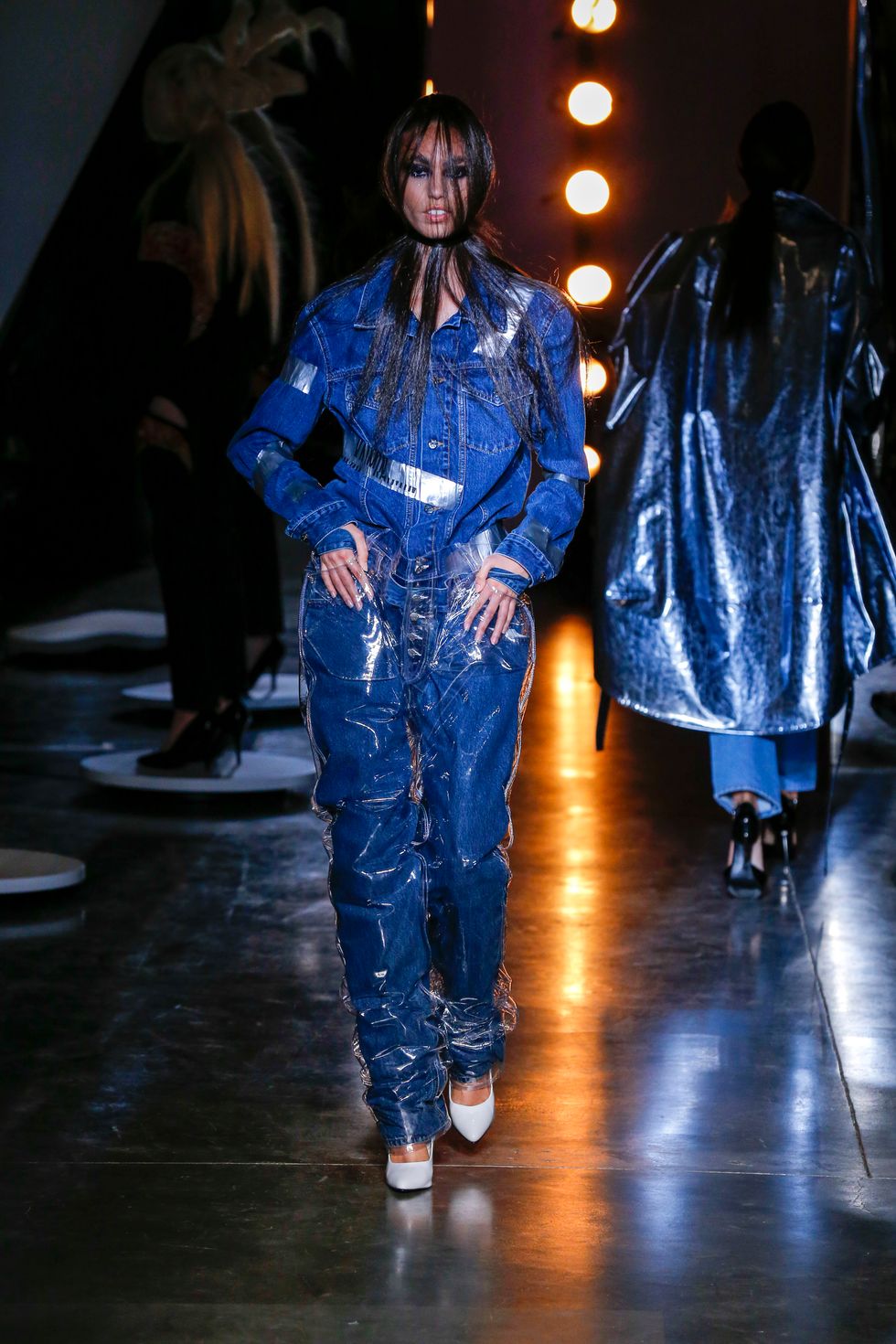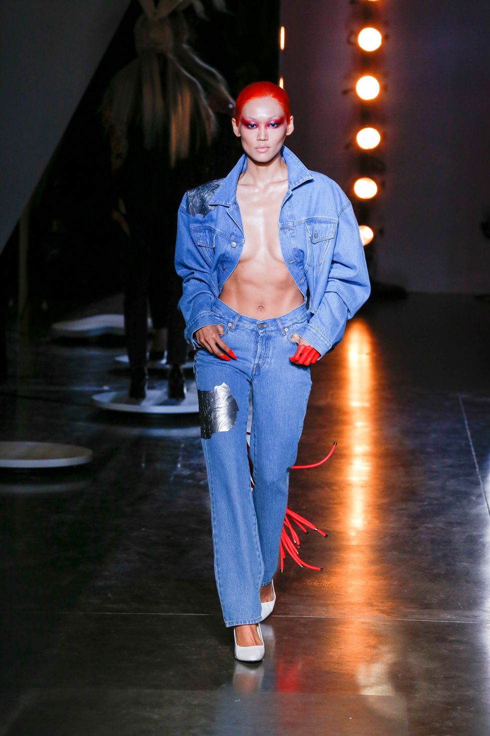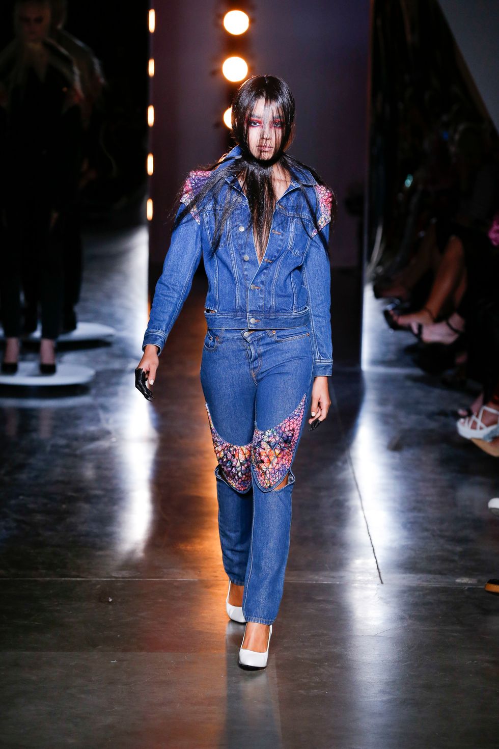 What was perhaps most unexpected from her Spring collection was the fact that the sexy space-aged designer dropped down to earth, showing a brand new commercial denim line called SLFF (pronounced "self"). These aren't your mother's blue jeans, though: the "Stratasys x KAIMIN" 3D Print Denim Capsule Collection features 3D textiles printed directly on the denim looks, which has never been done before. The collection's intentions are mapped out in simply stated yet abstract directives aiming to "Refract different versions of self; Mutate desire and identity; Evolve in spirit and form." Leave it to Min to take it to the next level.
