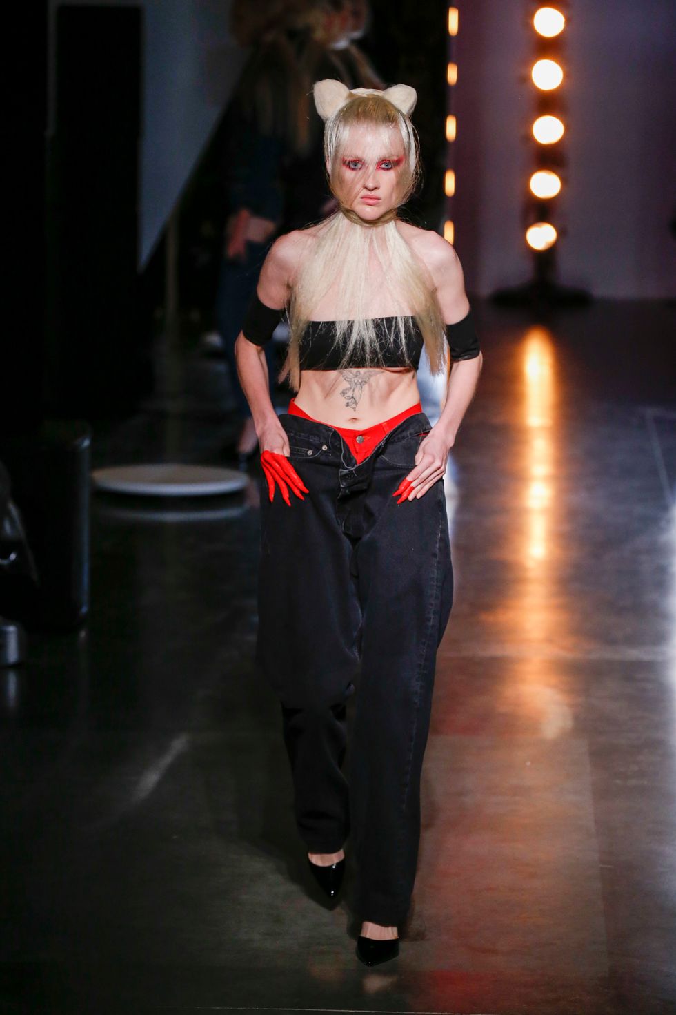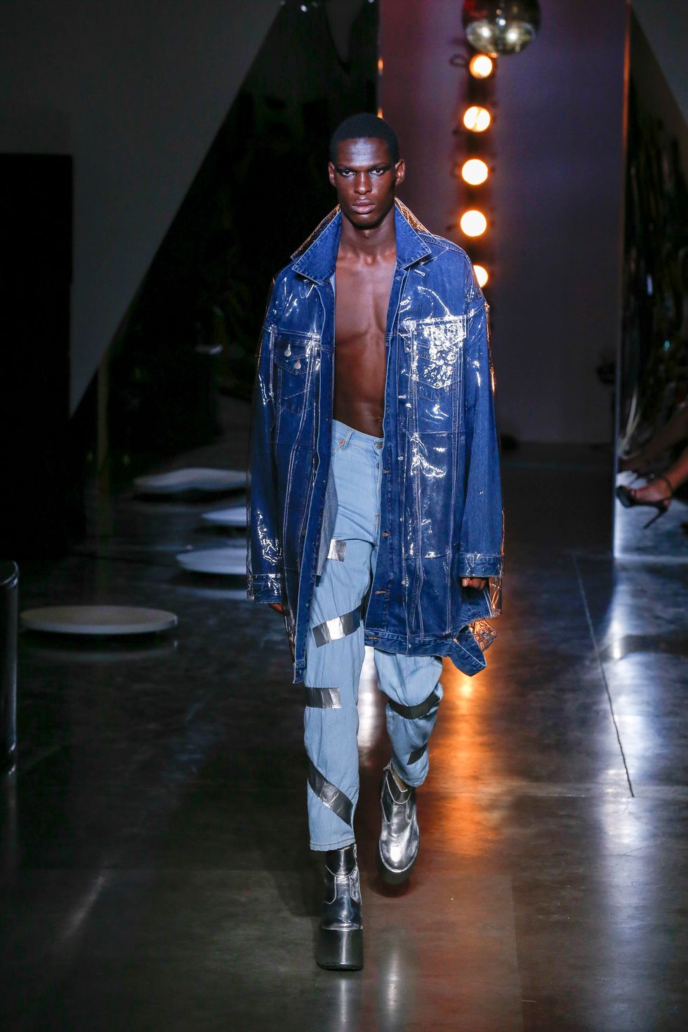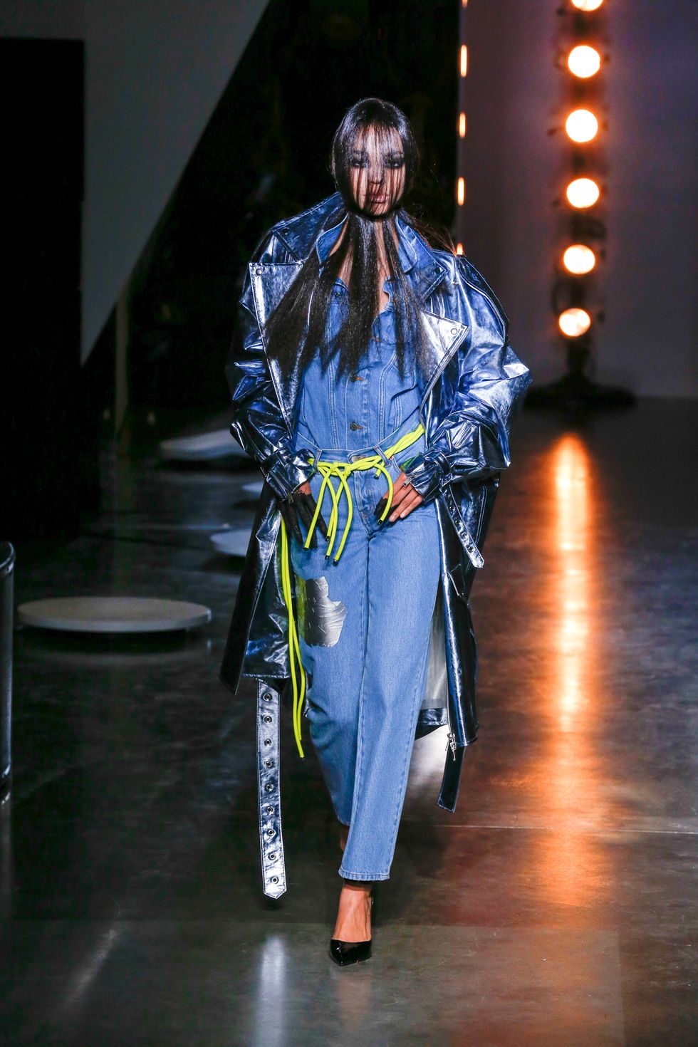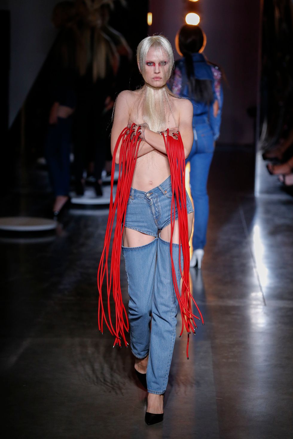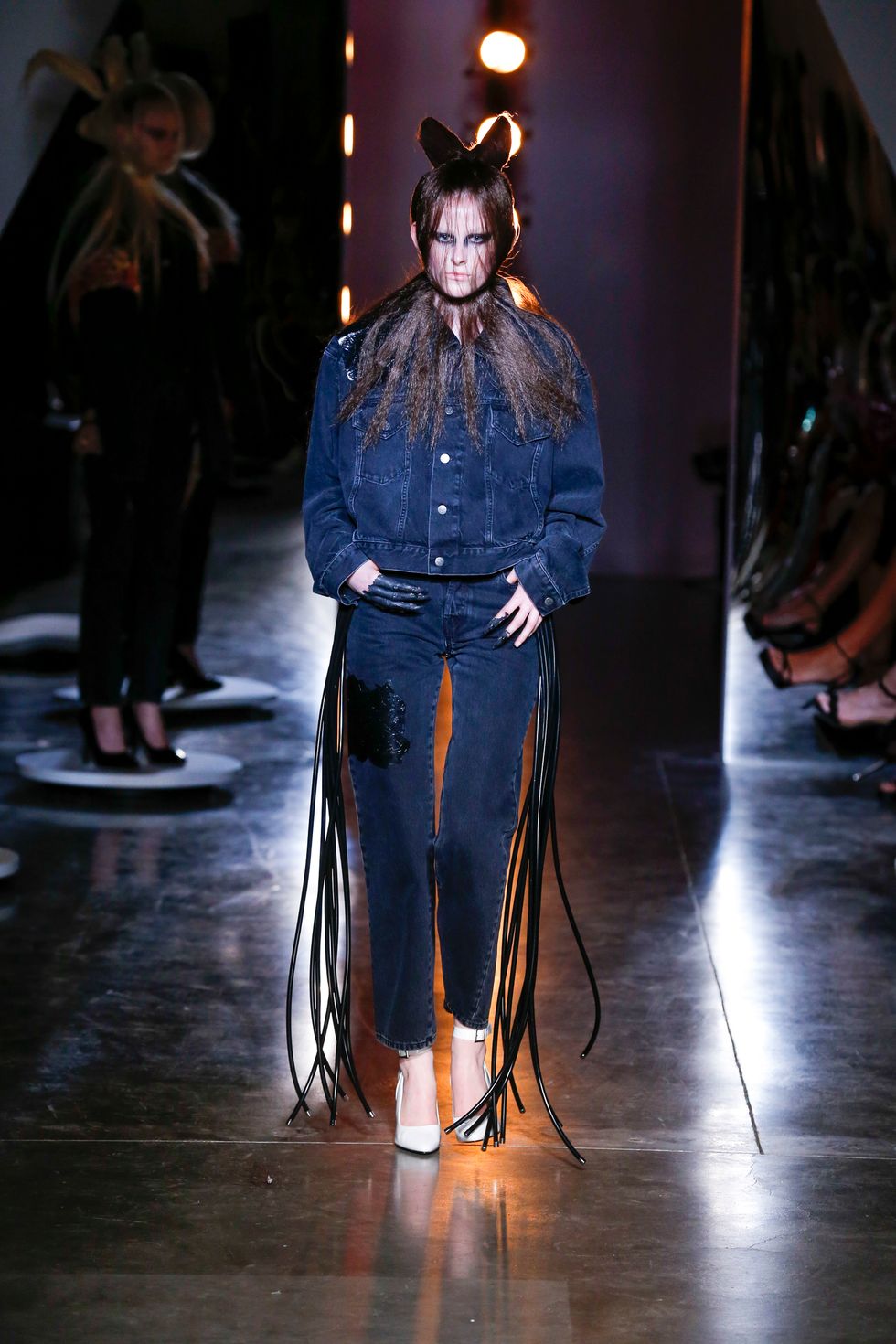 What was perhaps most unexpected from her Spring collection was the fact that the sexy space-aged designer dropped down to earth, showing a brand new commercial denim line called SLFF (pronounced "self"). These aren't your mother's blue jeans, though: the "Stratasys x KAIMIN" 3D Print Denim Capsule Collection features 3D textiles printed directly on the denim looks, which has never been done before. The collection's intentions are mapped out in simply stated yet abstract directives aiming to "Refract different versions of self; Mutate desire and identity; Evolve in spirit and form." Leave it to Min to take it to the next level.