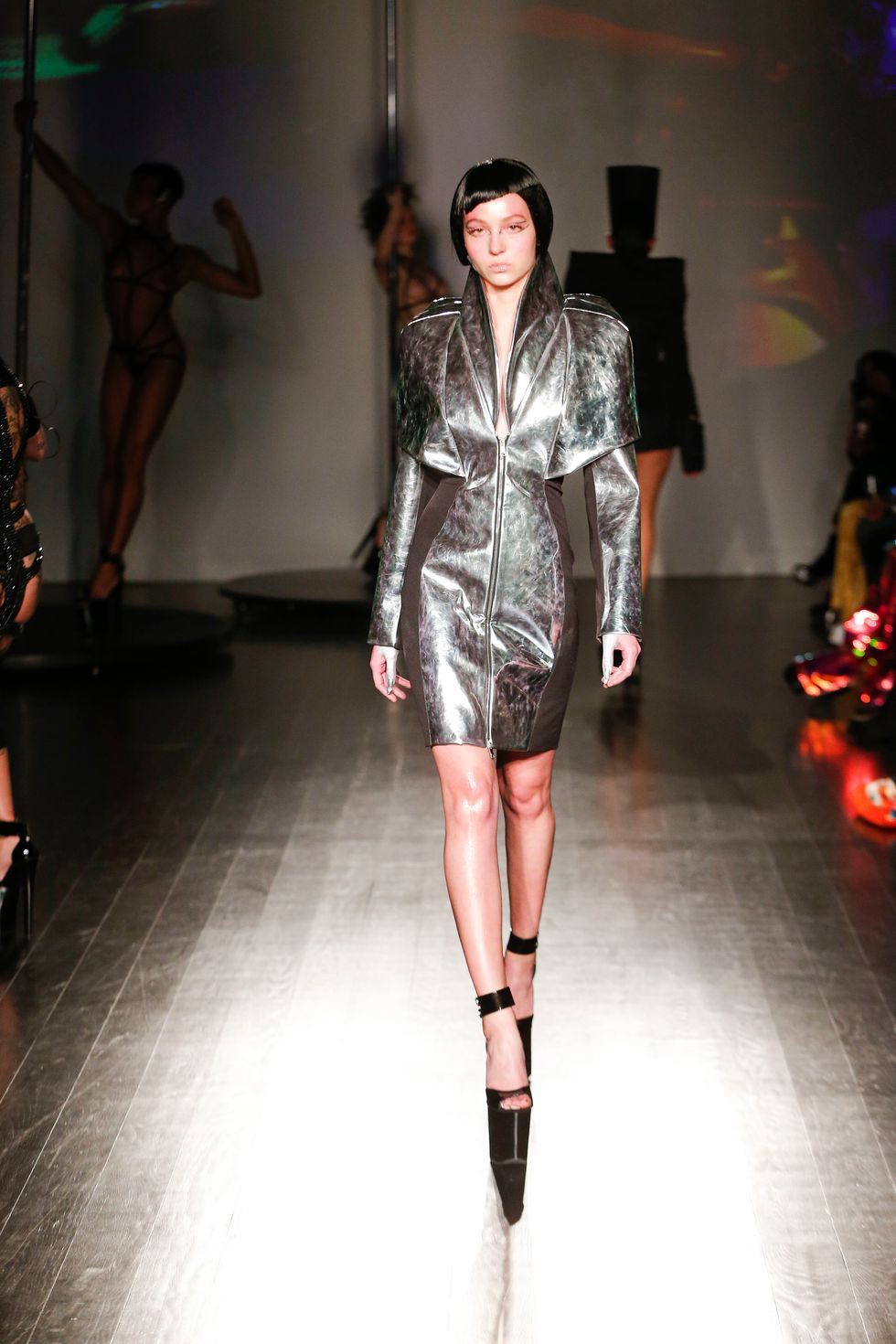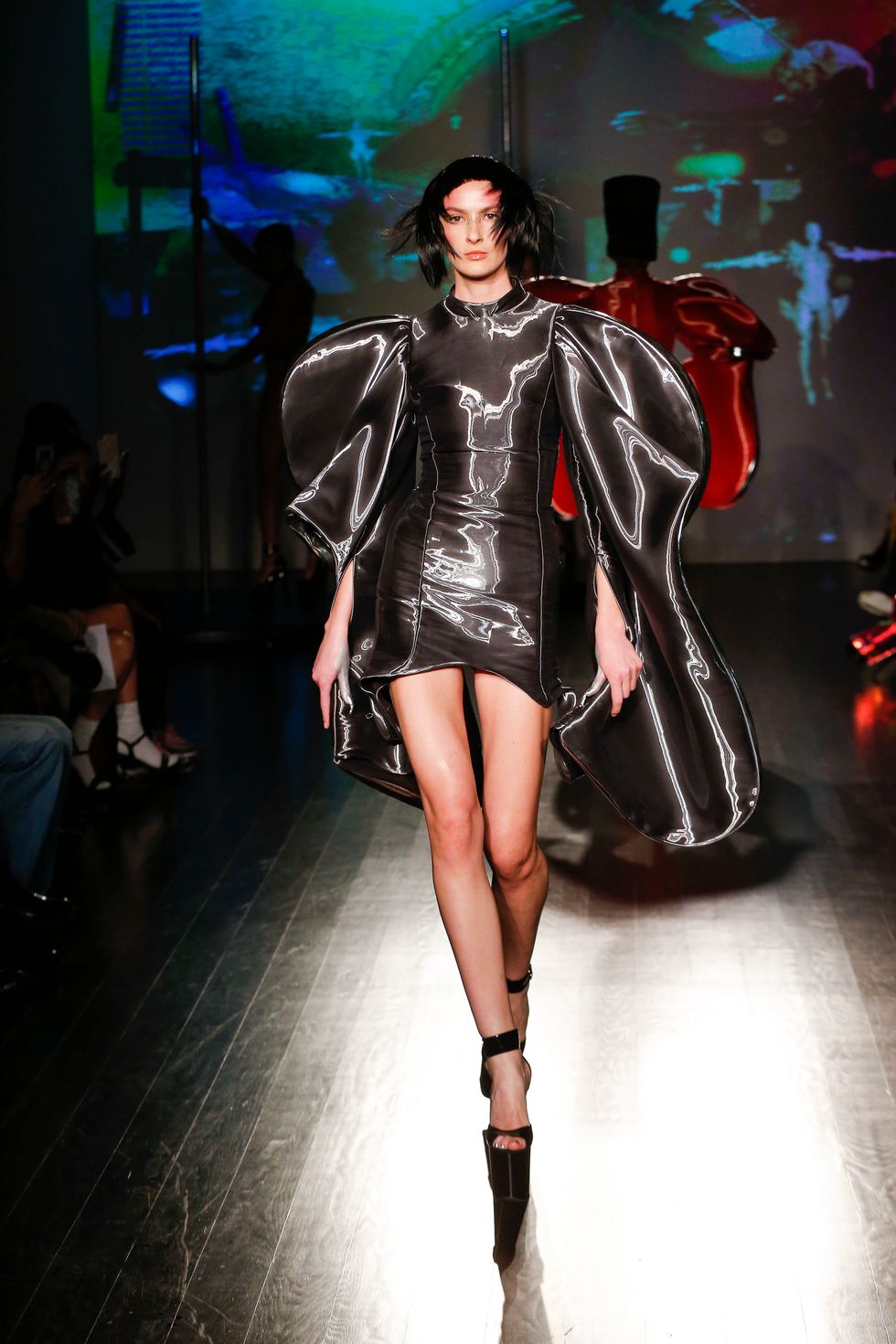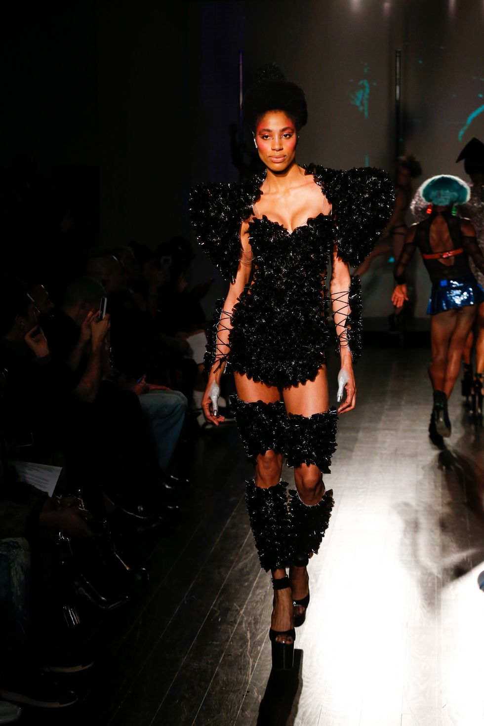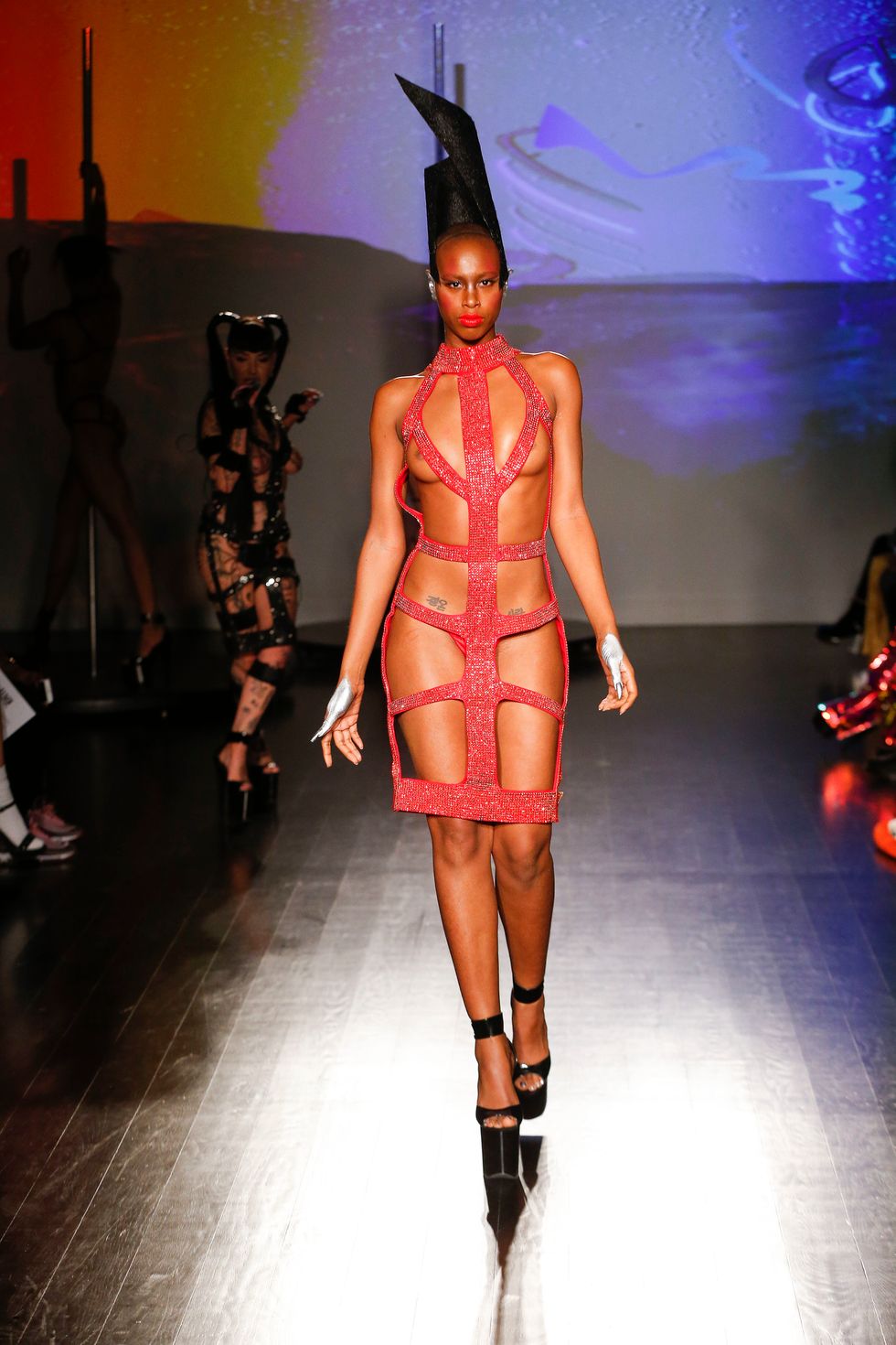 At Kaimin's fall 2019 show, the brand presented its trademark sexually charged clubwear. Cut-out dresses were more cut-out than dress, sleeves dipped to the floor, and some garments featured multi-layered shoulder ornamentation that felt like the ideal drag queen armor. Iconic makeup artist and Björk collaborator Hungry sported a rhinestone face mask. The entire event was high-energy; pole dancers did their thing behind the strutting models, and Brooke Candy performed on the runway, twerking on delighted guests in the front row. She brought up Bronx rapper Maliibu Miitch for the finale, and the crowd went wild.