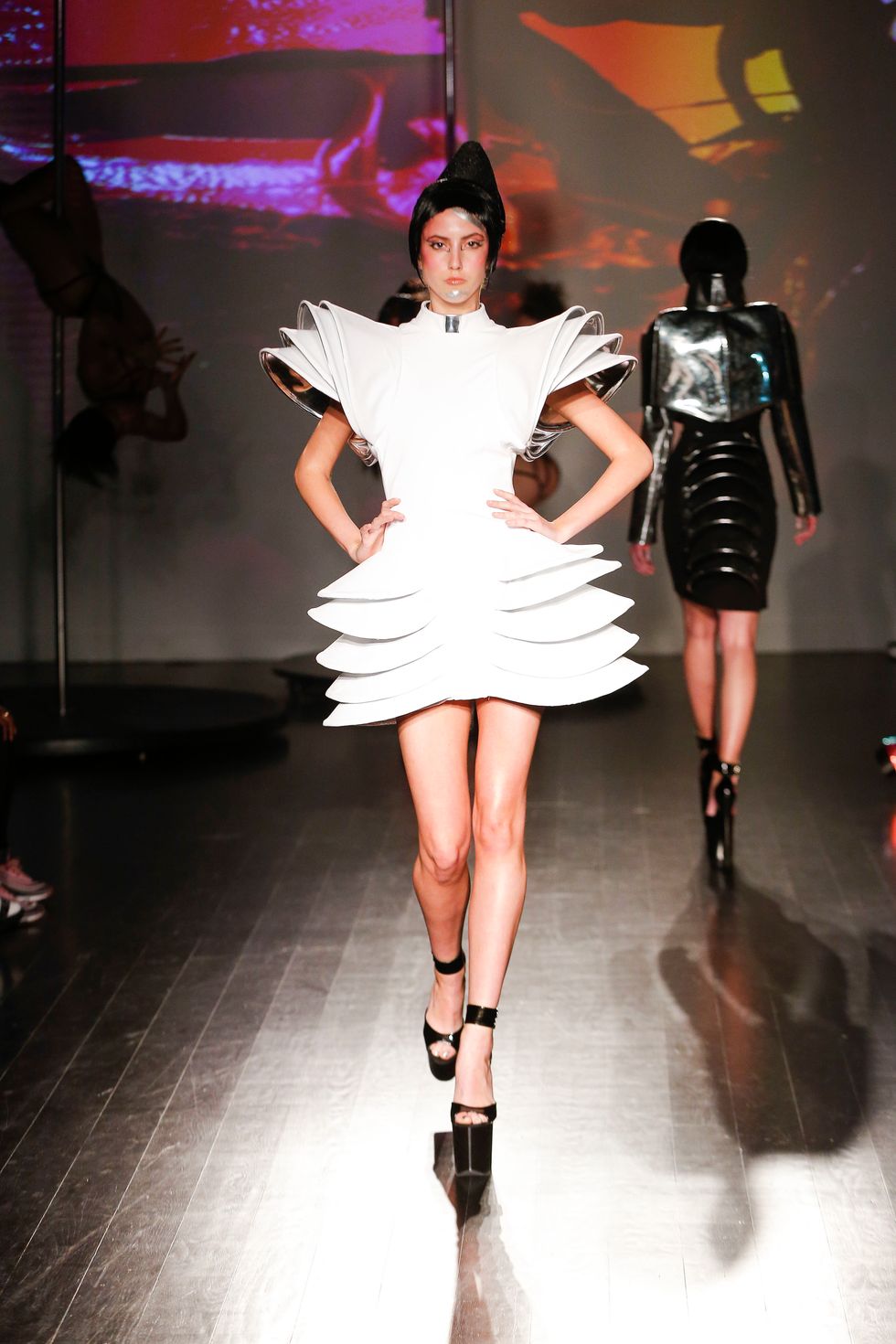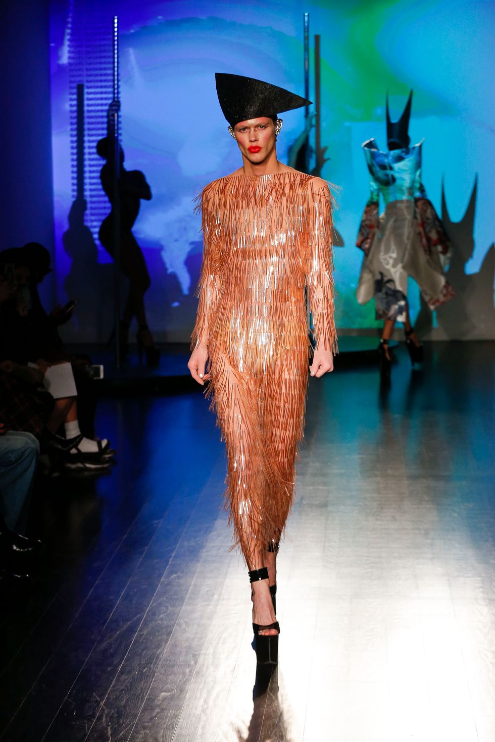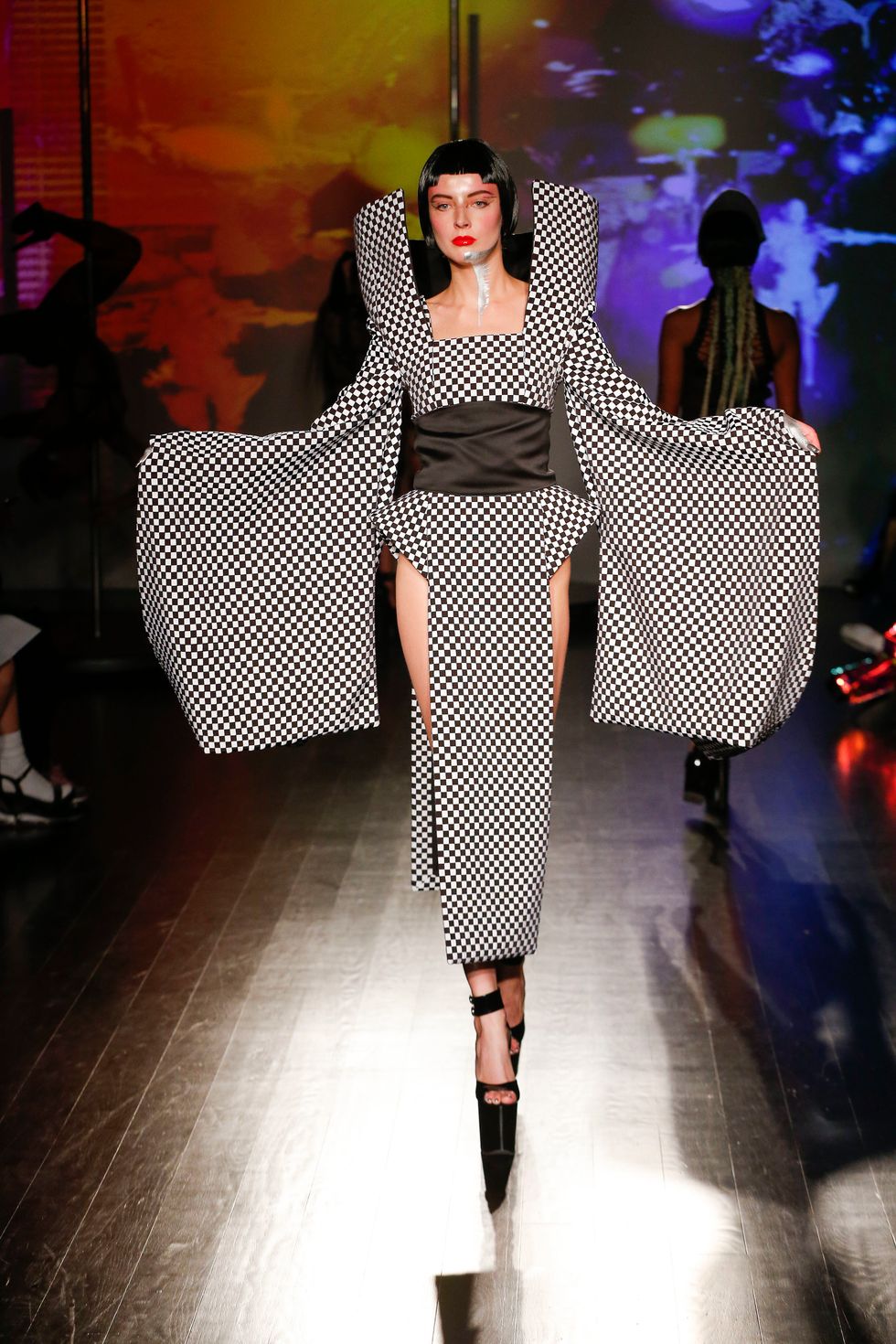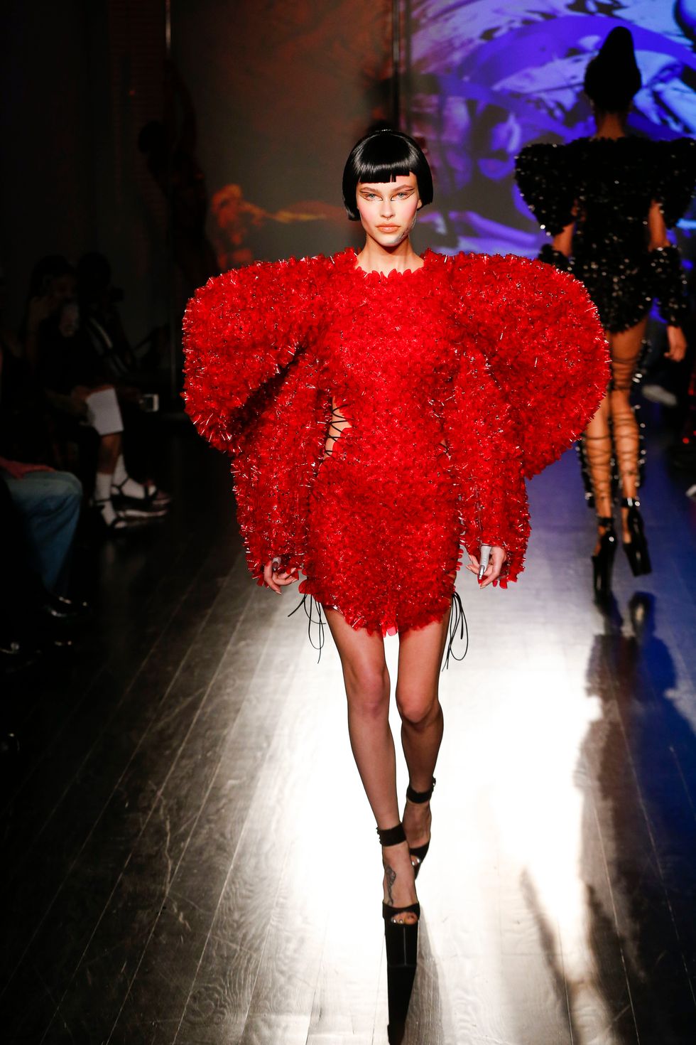 At Kaimin's fall 2019 show, the brand presented its trademark sexually charged clubwear. Cut-out dresses were more cut-out than dress, sleeves dipped to the floor, and some garments featured multi-layered shoulder ornamentation that felt like the ideal drag queen armor. Iconic makeup artist and Björk collaborator Hungry sported a rhinestone face mask. The entire event was high-energy; pole dancers did their thing behind the strutting models, and Brooke Candy performed on the runway, twerking on delighted guests in the front row. She brought up Bronx rapper Maliibu Miitch for the finale, and the crowd went wild.