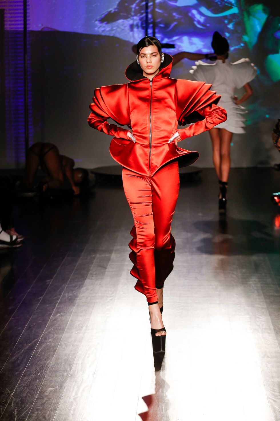 There was, clearly, a lot going on. But the whole show was anchored by visuals from design studio Team Rolfes, who have previously collaborated with brands like Nike and Landlord. Brothers Andy and Sam Rolfes are traditionally trained artists who specialize in figurative animation, VR, and mixed animation collage. They incorporated sophisticated technology into the Kaimin show; Brooke Candy sported their motion capture suit during the performance in order to, as Andy put it, "create a dialogue between what was going on in front of you and the background."