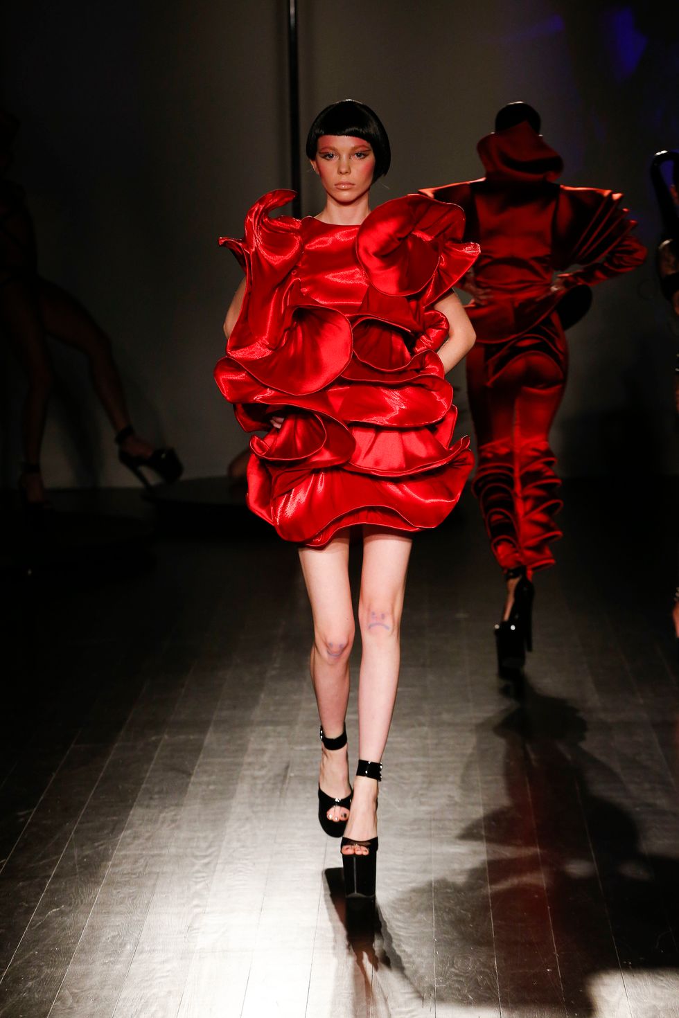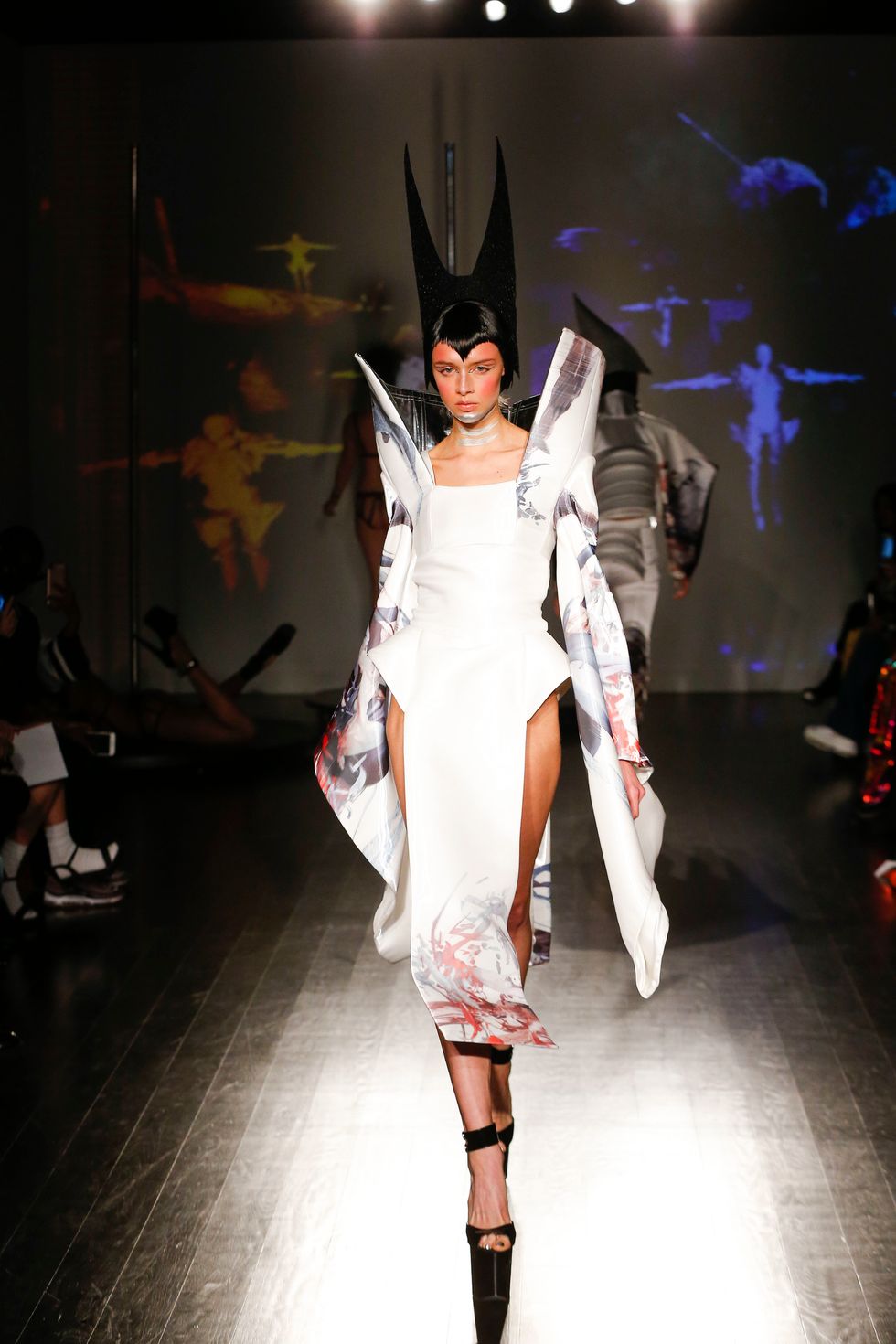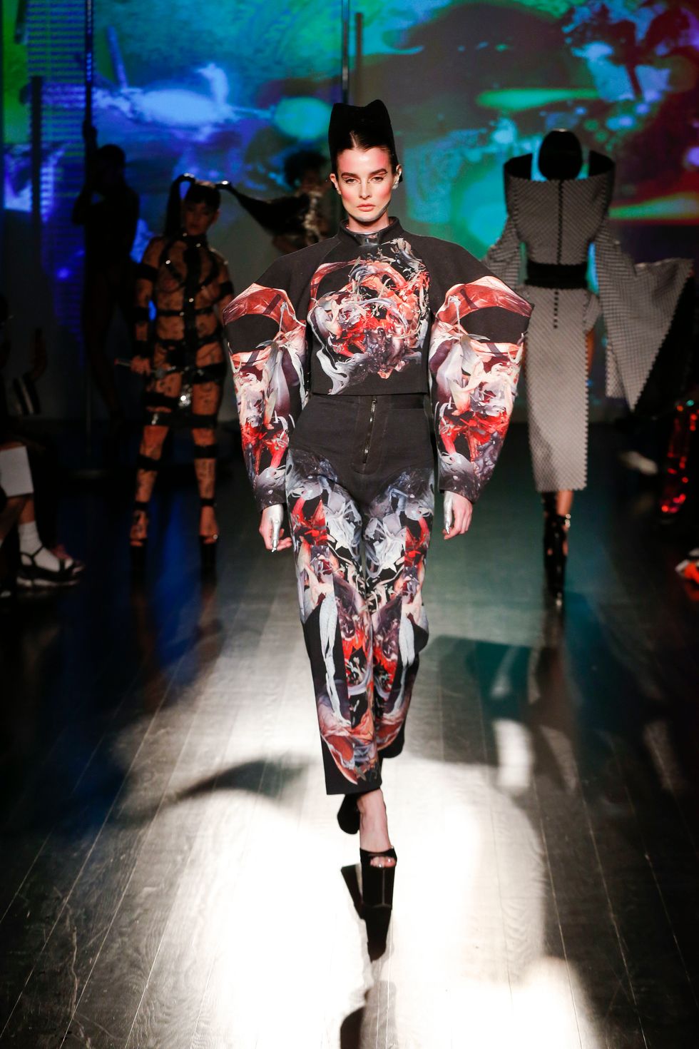 Sam's prints were also incorporated into multiple Kaimin looks. For the runway backdrop, the brothers wanted to "reflect the prints that were chosen along with generally reflecting Kai's image, and this organic, cybernetic, sexual character that she's aiming for." It's safe to say they succeeded.