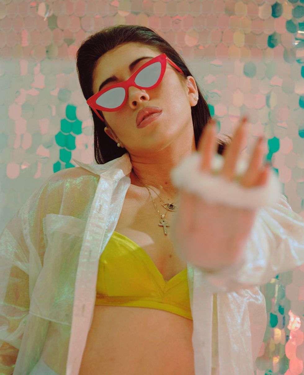 Sunglasses by Adam Selman x Le Specs, Shirt by Bunny Holiday, Bra by Eres, Pants by Chéri, Earrings by Jewelry Bar, Gloves by Queenie Cao