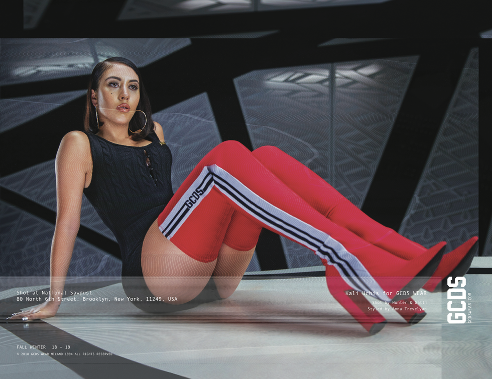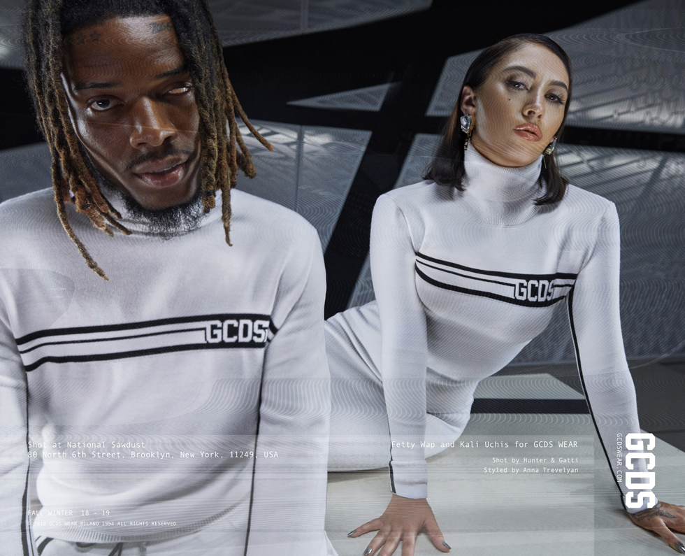 However, the campaign's cosmic looks retain a classic GCDS retro-athletic touch, courtesy of the racing-stripes on the cherry red thigh highs Kali Uchis wears, the horizontal stripes on the pairs' white knits, and the iconic logo on the black puffer worn by Fetty Wap.
