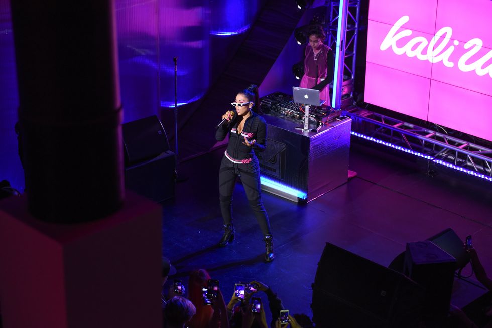 They were also surely trying to see a performance by Kali Uchis, who looked sleek and gorgeous in a black and pink athleisure look from the line. She sang hits like "Tyrant" and "Dead to Me" on a stage downstairs in the middle of an architectural feature that resembles a metallic skate ramp, giving the whole thing a fun fishbowl effect.