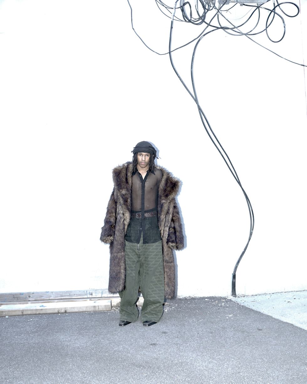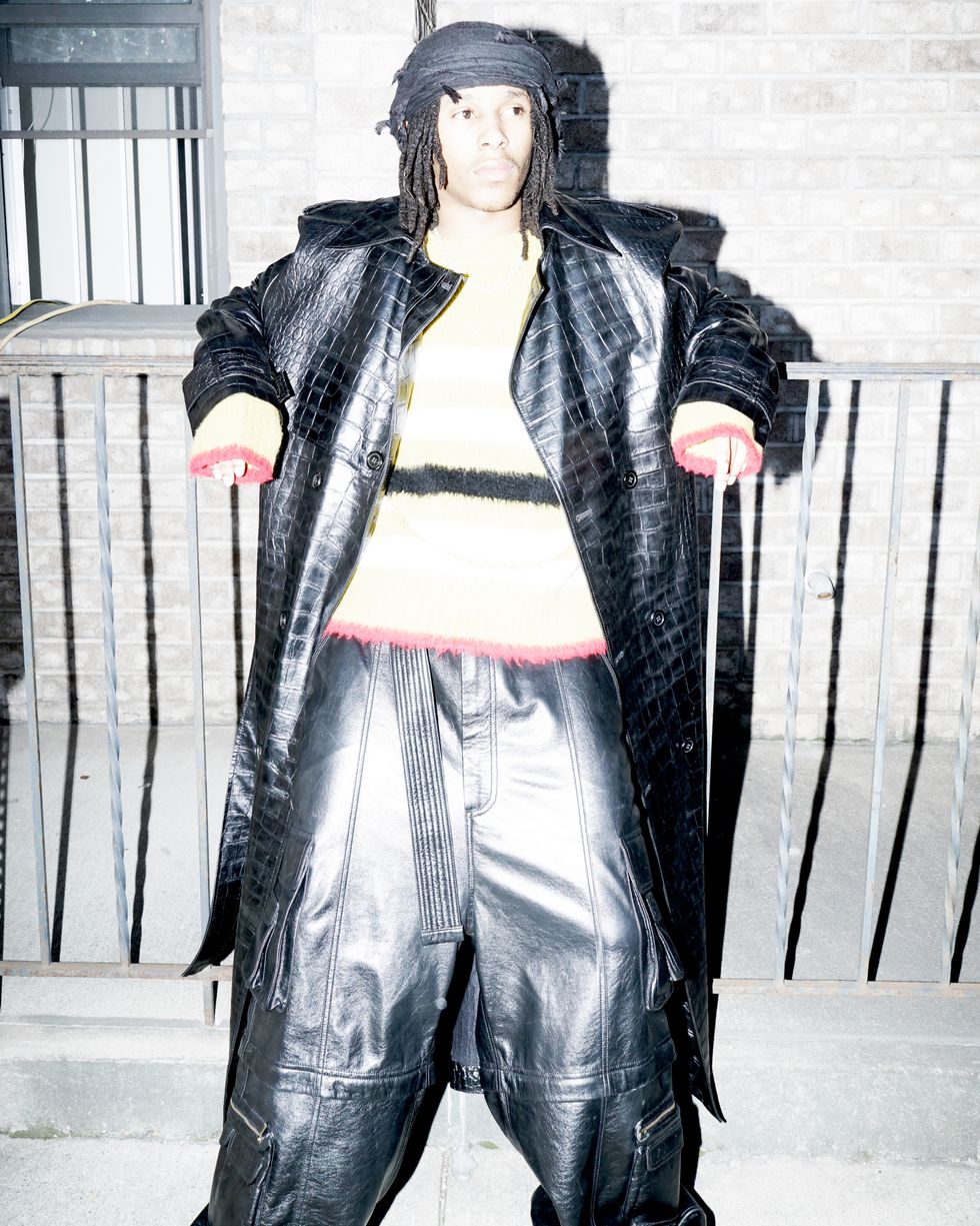 Leather jacket: Det Blev Sent, Denim jacket and pants: Marine Serre, Belt: Brigade, Shoes: CamperLab