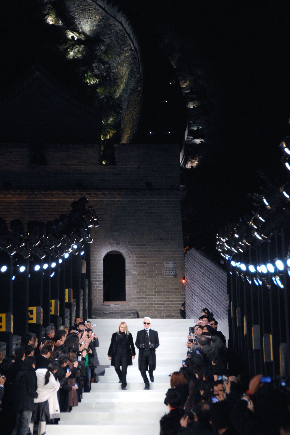 Going to a Chanel show was something a fashion person never forgets. Everything about it said chic and luxury, from the ushers who showed you to your seat to the little gift bag of fabulous treats. The sets were beyond anything you can imagine. I've been to Chanel shows with sets that included a lipstick the size of a building, a giant carousel with Chanel bags instead of horses, a working rocket ship, an iceberg brought from and (and returned to) the Arctic, a grocery store fully stocked with customized Chanel items. You felt like no one ever thought about the budget, they only thought about what was the best way to achieve Karl's fantasy. Still maybe the most other-worldly setting for a Karl show was the Fendi show on the Great Wall of China in 2007 which I attended. To see models stroll down this historic and legendary monument followed by Karl with his unmistakeable silhouette topped by the white ponytail was truly beyond any Hollywood movie. It was pure magic.