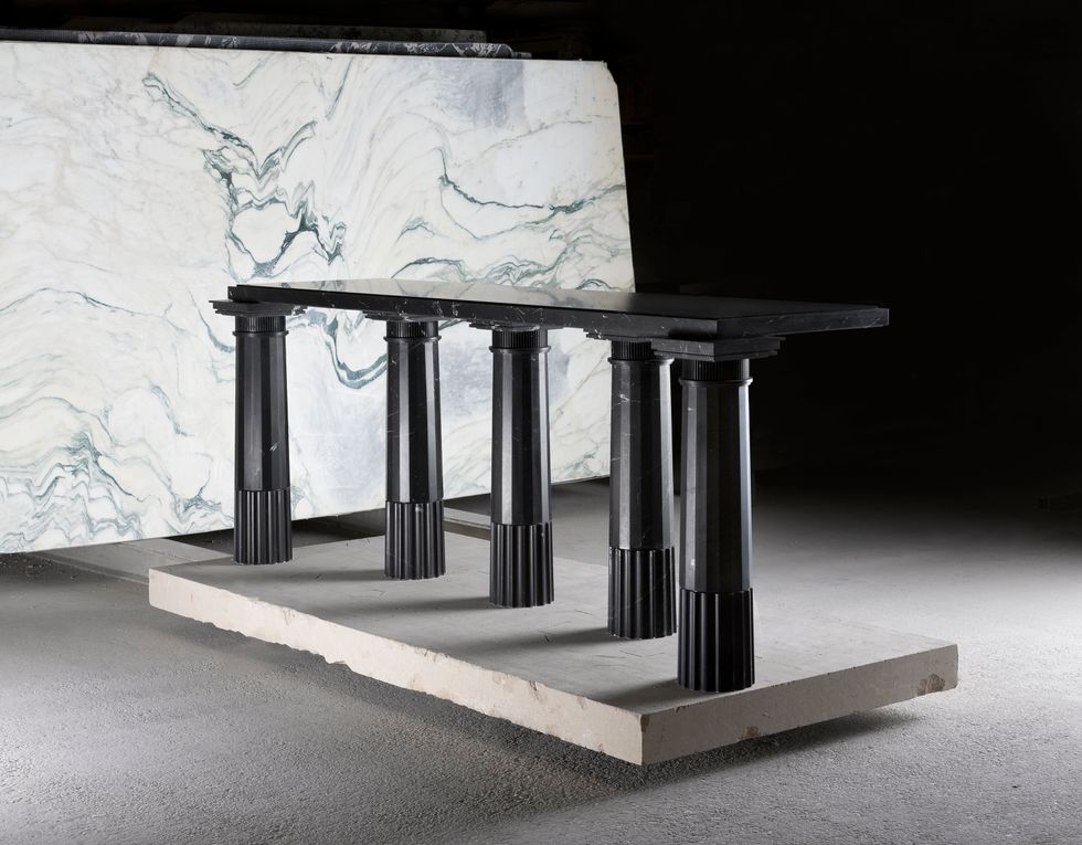 Titled Architectures, the range of gueridon and pier tables, lamps, fountains, and mirrors designed by the Kaiser himself are informed by ancient Greco-Roman design. In keeping with that epoch's aesthetic, pieces have been excavated from a slab of rare, white marble with dark gray veins called Arabescato Fantastico (sourced from a quarry that's been untouched for over thirty years) and blocks of Nero Marquina marble, a black version of the stone with white streaks running throughout.