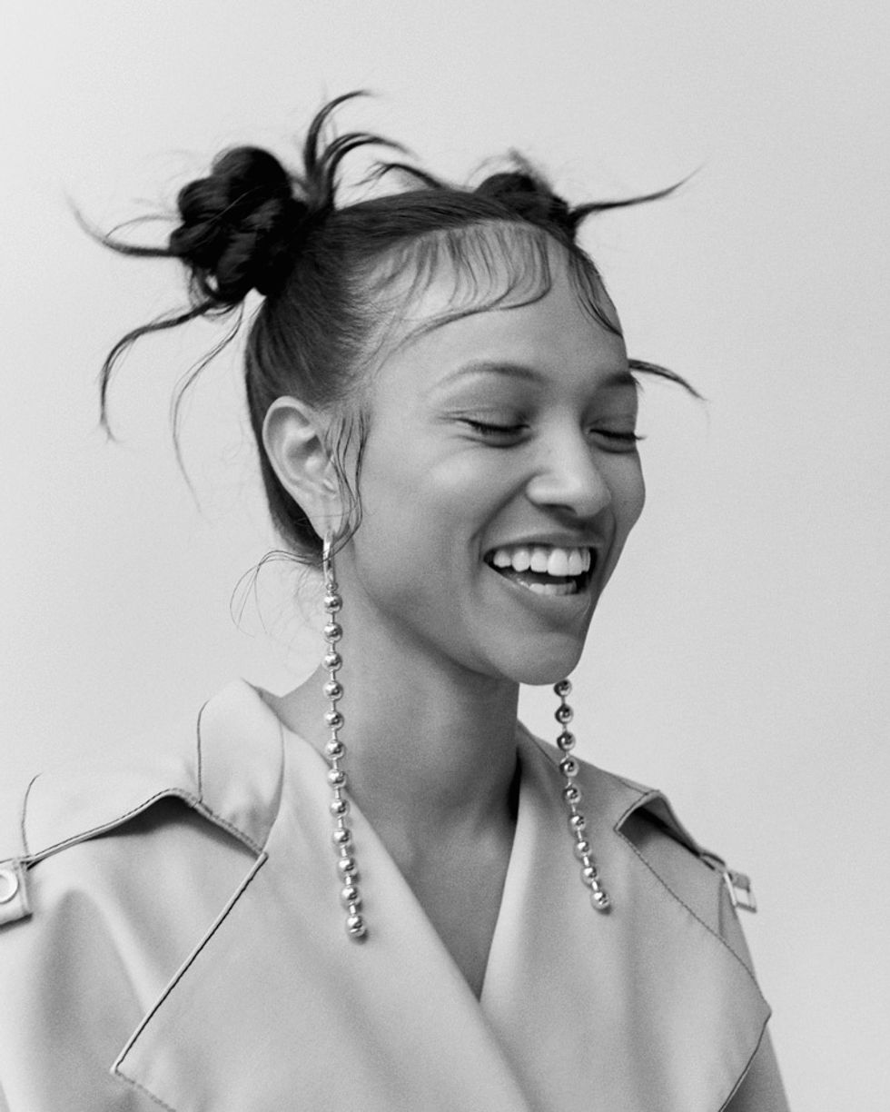 Jacket: Adeam, Blouse: Lyell, Earrings: Alison Lou