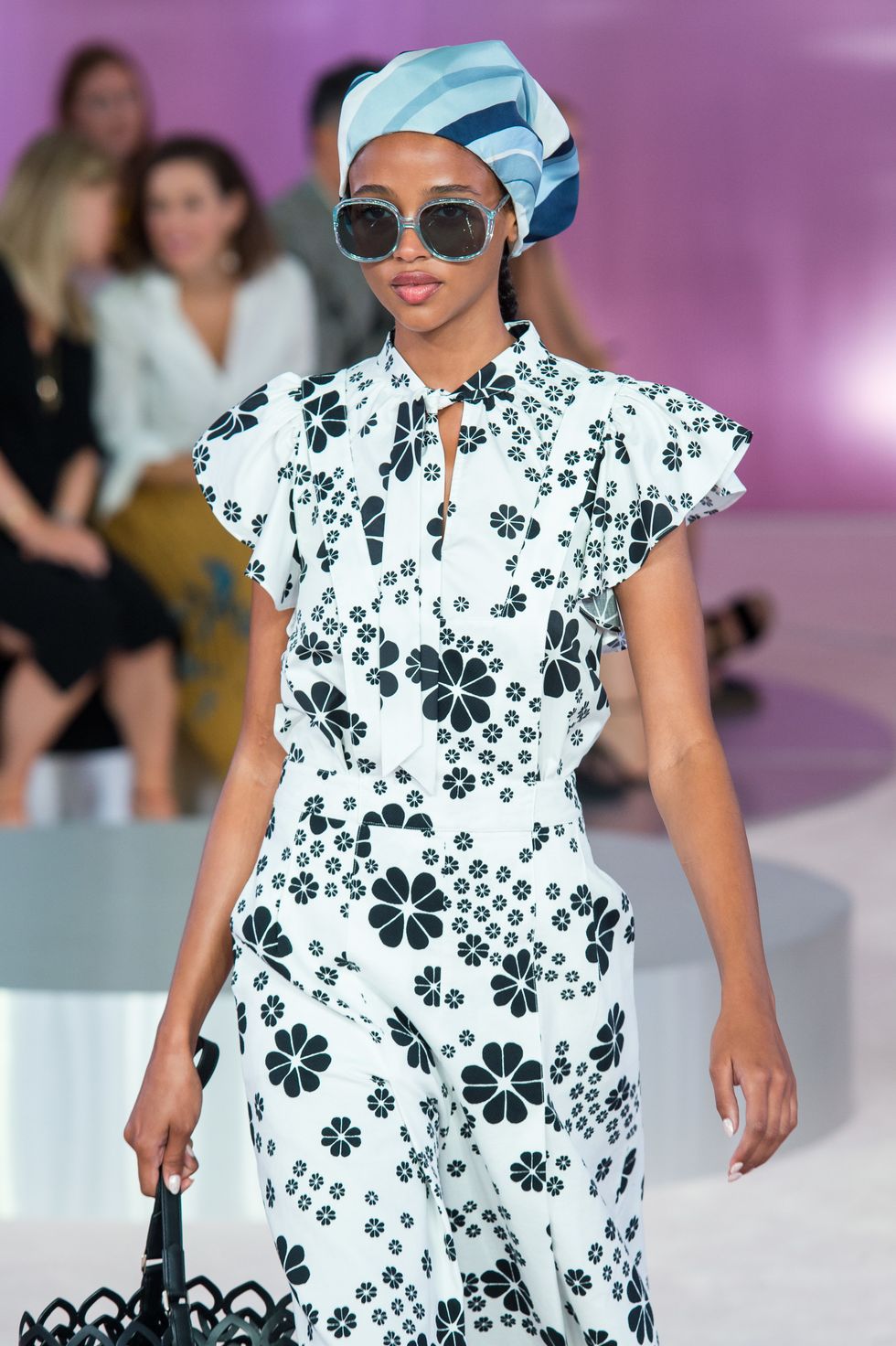 Our favorite pattern in the show was the novelty four-leaf clover print made of four spades (the playing card suit). It looked fresh on the first look — a shirt-dress with matching head scarf and choker. Our favorite bags were the big totes made up of, that's right, spades.