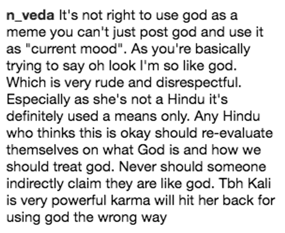Many of her 63.5 million followers and her friends went off on the post, commenting that it was blatant cultural appropriation and disrespectful to turn a Hindu deity into a meme and to compare oneself to a god.
