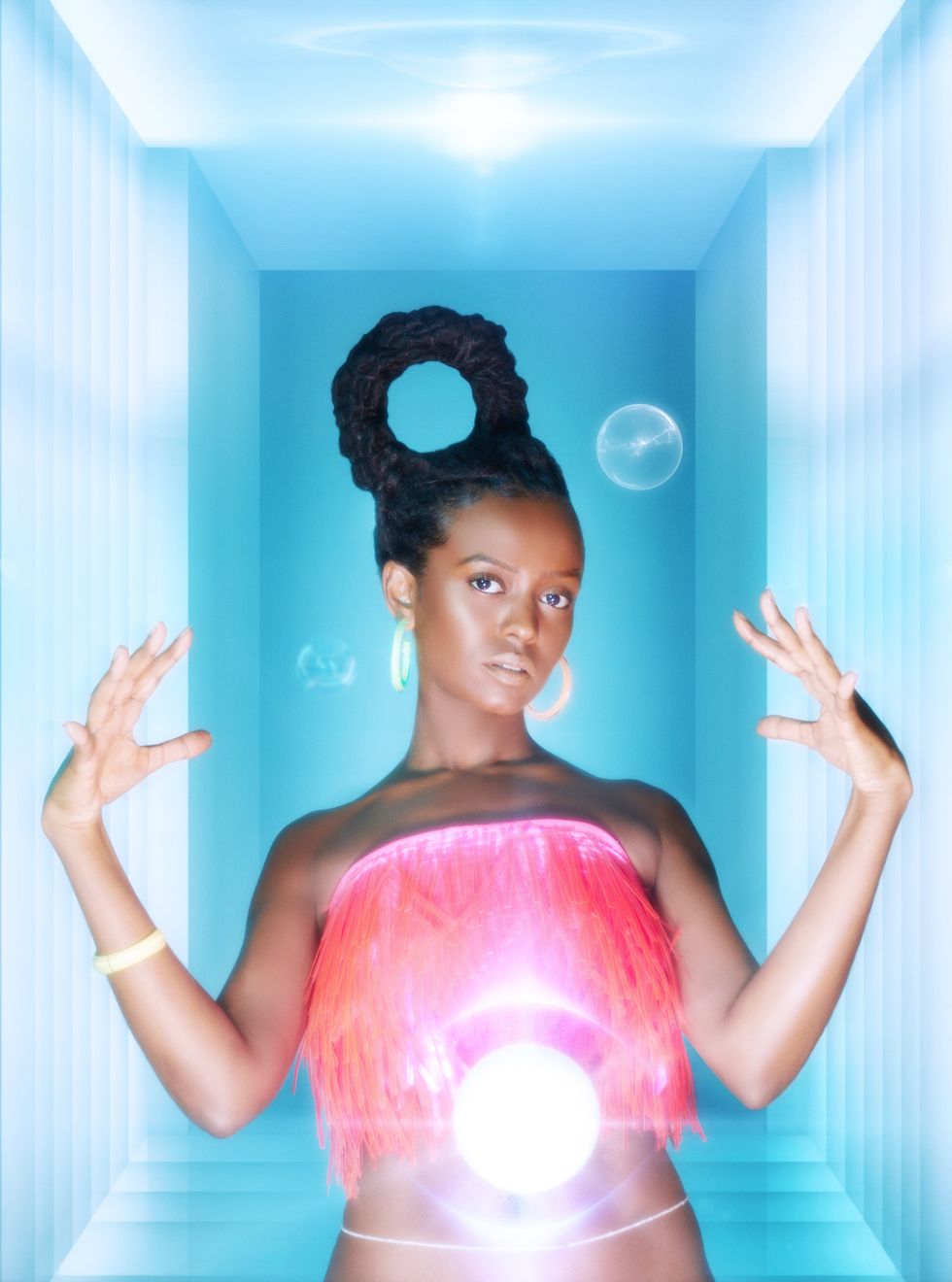 Coat: Paco Rabanne, Earrings: Knights of New York, Boots: Y-Project x Ugg, Body Chain: Kelela's Own
