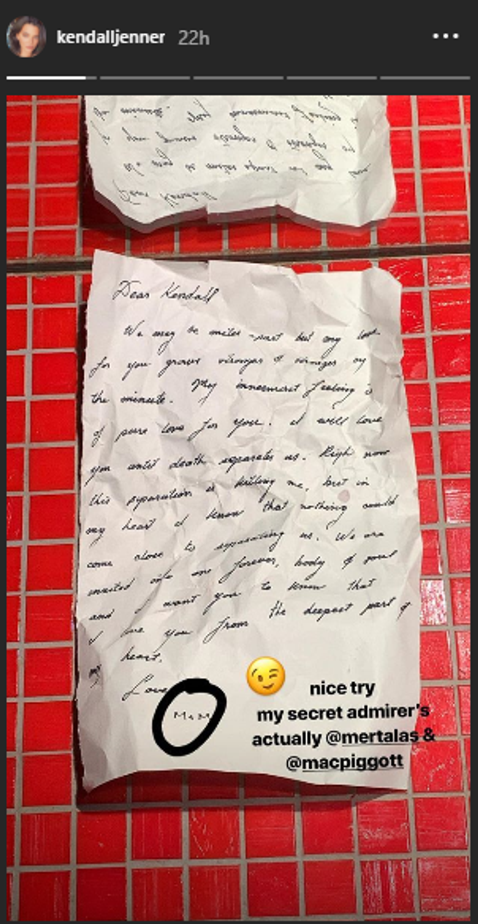 Cute stunt, although it doesn't even make that much sense! The letter implies distance ("We may be miles apart but my love for you grows stronger & stronger by the minute"), but Jenner hung out with Mert & Marcus all weekend in London, leading up to the British Fashion Awards. They were all photographed together and everything.