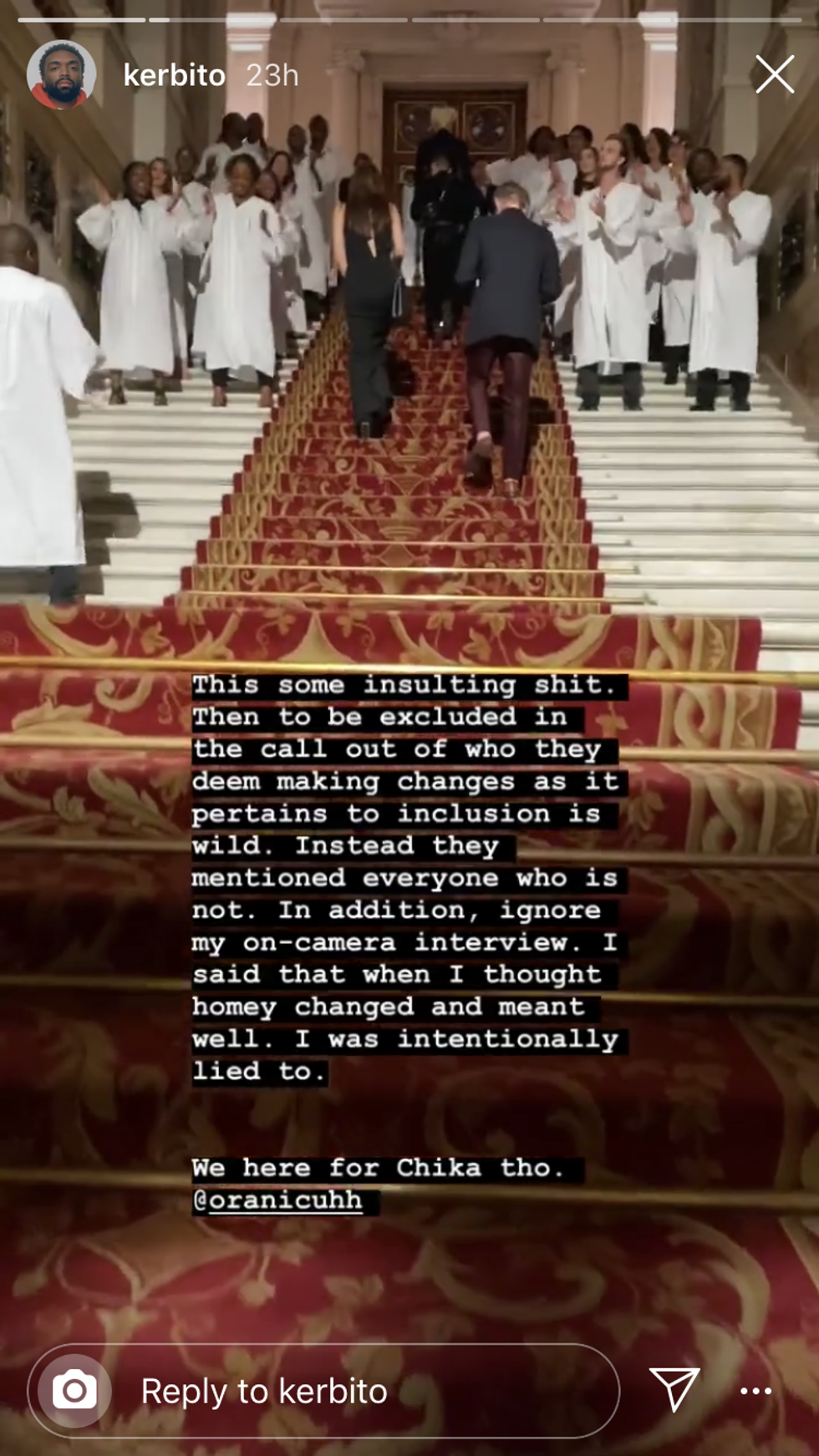 "Homage without empathy and representation is appropriation," he wrote. "Instead, explore your own culture, religion and origins. By replicating ours and excluding us— you prove to us that you see us as a trend. Like, we gonna die black, are you?"