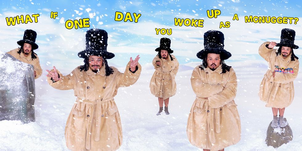 And this hat of Frost’s is front and center in his latest drop, the Kerwin Frost Box for McDonald’s. Specifically, a black top hat adorned with a mint-green hatband and the apocryphal golden arches, which Frost wears in all the collab’s promo. But also his alter-ego, in toy form, a tiny personified Chicken McNugget, wears the hat, too. This mini-Kerwin is one of a cast of characters of McNugget Buddies, which Frost designed, each one with a backstory and personality expressed through their personal style, and a community member in a neighborhood-universe Frost dreamt up called “Frost Way.” Like the Happy Meal toys we all remember from childhood, you can collect McDonald’s x Frost’s McNugget Buddies one at a time when you get the boxed meal at your local McD’s. As an extension of the project, Frost also designed a life-size version of the shoes that his Kerwin McNugget Buddy comes with, so you can get a pair yourself and match the toy.