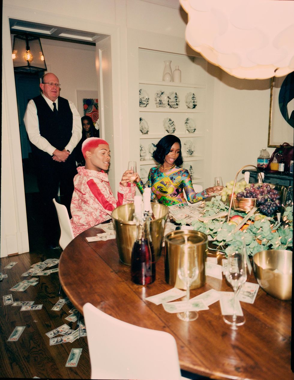 Elsewhere in the "Gold Digger" visual, Kenn and Dior taunt their butler and throw around stacks of dollar bills at a lavish dinner table. There's also a sleepover complete with a pillow fight, and some all-star beauty looks from Kenn. Those perfectly sculpted eyebrows. That frosty hot pink hair.