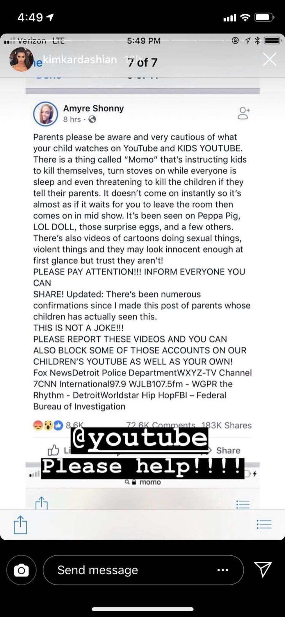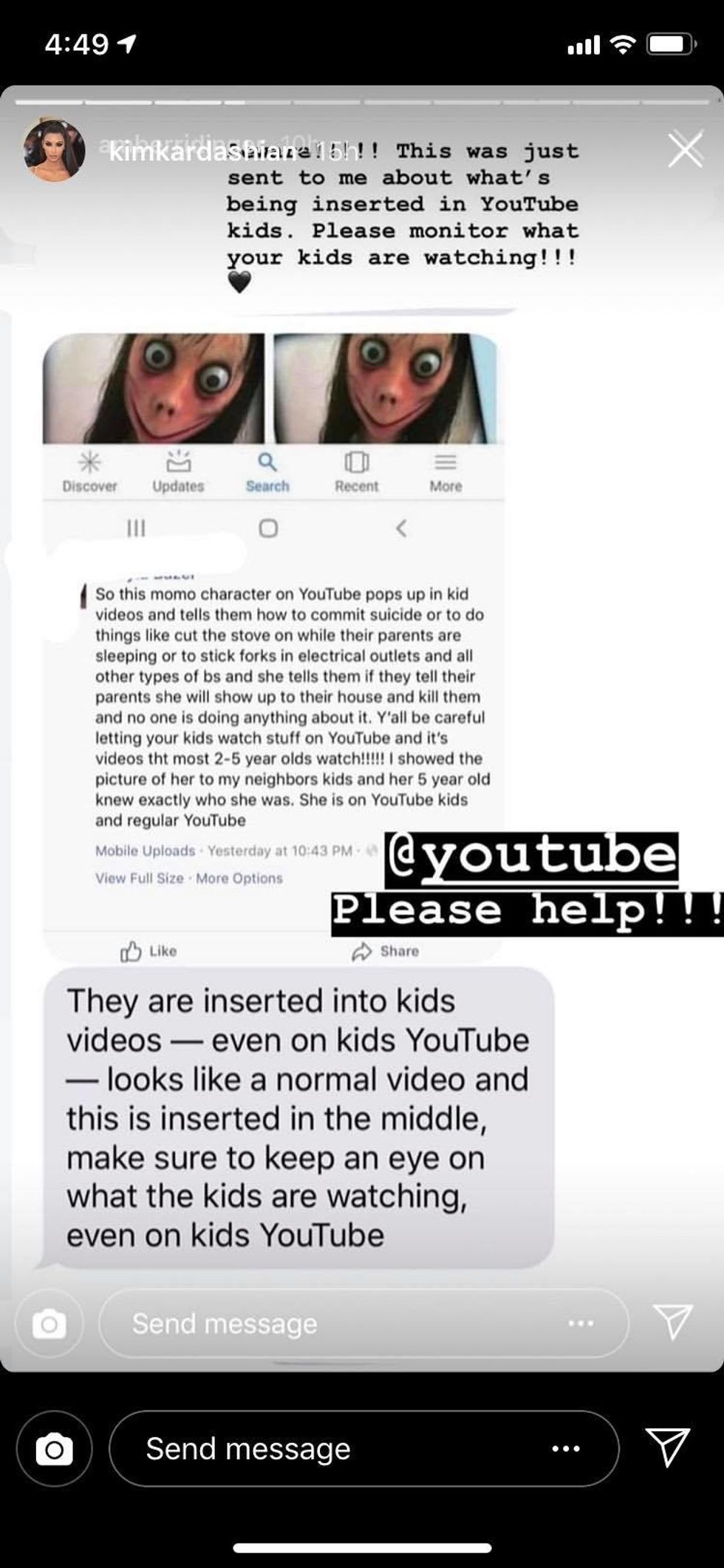 Kim became aware of Momo after a screenshot of a Facebook status about the phenomenon written by a concerned parent circulated on Instagram and Twitter. Perhaps fearing for the welfare of North, Saint, and Chicago, Kardashian shared the screenshot on her Instagram story, adding "@YouTube Please help!!!"