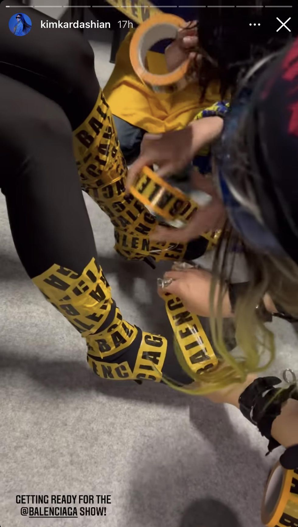 But it was her outfit that stole all the headlines yesterday: a black bodysuit wrapped entirely in yellow Balenciaga-branded caution/packing tape, which made a "sticky tape-y sound" when she walked. She documented the process on her Instagram Stories, showing four Balenciaga assistants wrapping her spandex look and boots in the aforementioned tape, which took 30 minutes to create. (A ready-to-wear version appeared on a model on the runway.)