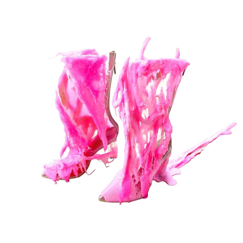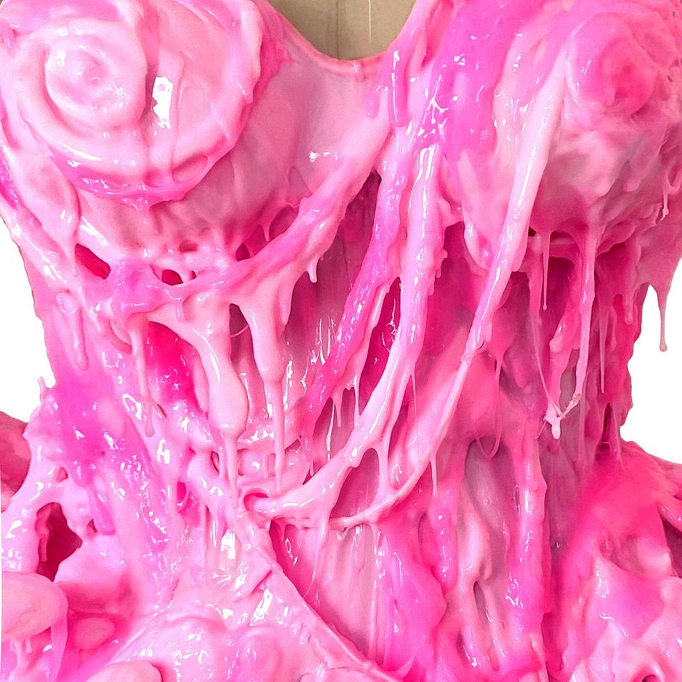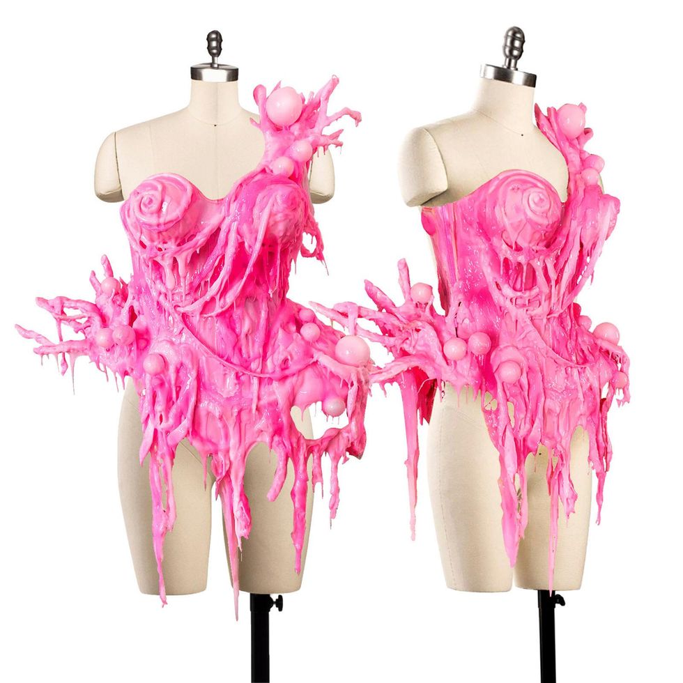 Using a clear vinyl base with "an insane amount of boning" so it'd be structurally sound, Habana and his team "crafted slimy shapes out of cut and melted EVA foam" that they adhered to the dress form and layered repeatedly. Habana then dipped holiday ornaments in silicone for the bubbles on top, and added more EVA foam and silicone to existing clear heels as footwear. "We were given a good amount of time to realize this look, which is always appreciated when it comes to working with new mediums," he said.