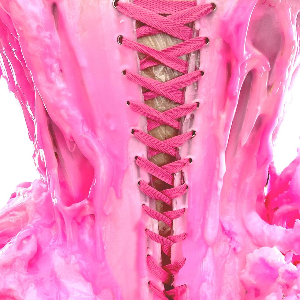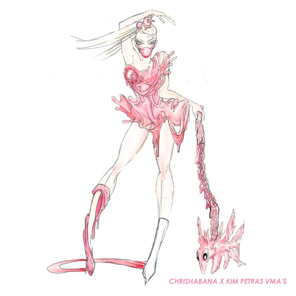 When it came to the VMAs, Kerr said "[Kim] had a clear idea of bubblegum bursting" to symbolize the idea that "as an artist, she is 'about to pop.'" He then built the stage show around Petras' dream of wearing burst bubblegum, which Habana completed with matching boots and a little pet monster. "It was inspiring to watch [Chris] make the dress in various stages. What's really fun about Kim is she's willing to dive into big ideas that other artists would be a little scared to explore."
