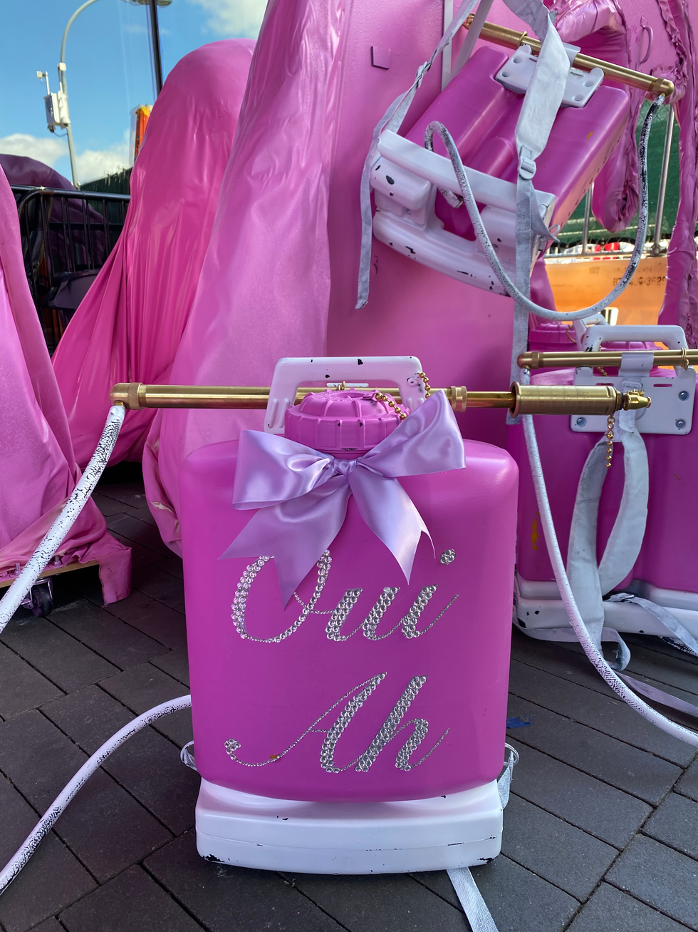 To execute the monster, Kerr collaborated with artist Barbara Hernandez to 3D render its form, while art director Emily Jones worked with Shop Studios to physically build it over the course of a week in New York. She also created the "Oui Ah!" backpacks that Petras' dancers wore in homage to the singer's signature catch phrase, "Woo Ah!" Australian artist Luca Dante was responsible for the surreal animation of Paris drenched in bubblegum with magenta fireworks filling the sky.