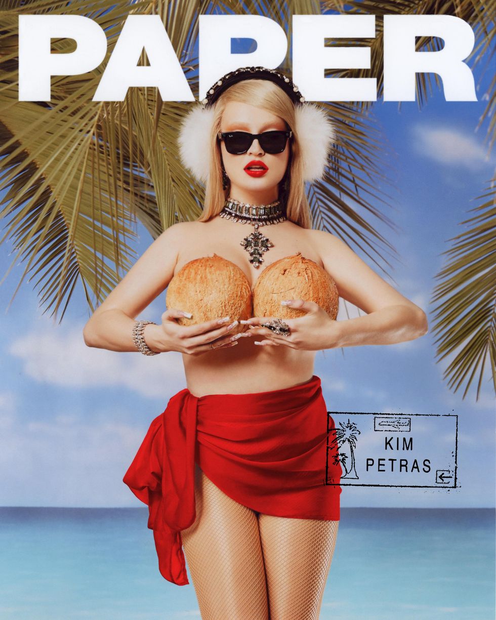 Kim Petras takes a break from filming a new music video for her viral single, “Coconuts,” which she recently debuted onstage at the European Music Awards and is now exploding across TikTok. Her real-life coconuts (nicknamed “Mary-Kate and Ashley,” or “Cartier and Tiffany”) are perched gloriously below her long, platinum-blonde hair and lavender eyeshadow. Juggling an intense day on set, Petras still looks radiant, beaming through bites of a hurried chicken salad, while appearing entirely at ease as she cracks jokes and giggles freely. That’s not to imply the Princess of “Woo Ah!”’ (Petras’ breathy catchphrase) wasn’t ever an impressive multitasker.