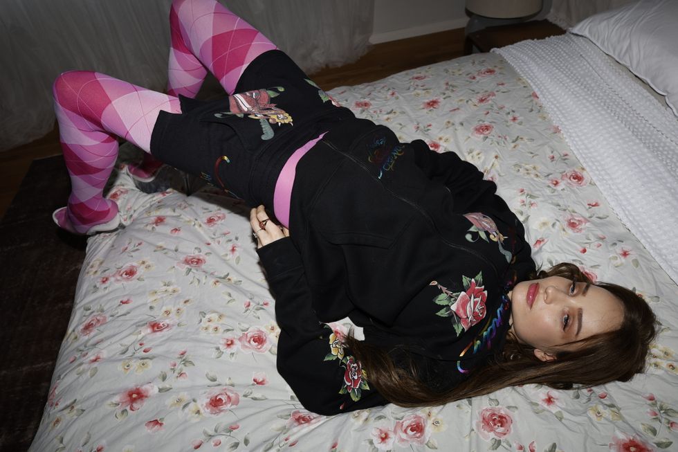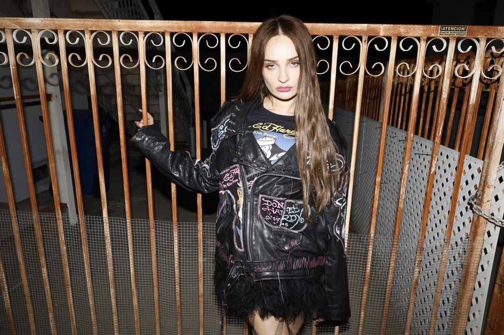But where do the Ed Hardy and Kim Petras multiverses meet? “Well, they meet at a skunk that smokes weed and says ‘famous’ under it,” she says, referencing the brand’s iconic character. “I really relate to that skunk.” In addition to the signature skunk symbol, the pieces include a black zip-up hoodie, denim mini skirt, low waist lounge pants and embroidered leather jacket. Rather than pulling from pop culture, Petras’ moodboard for this collection was more so inspired by everyday people from the early 2000’s who would post pictures in their bedrooms wearing Ed Hardy.