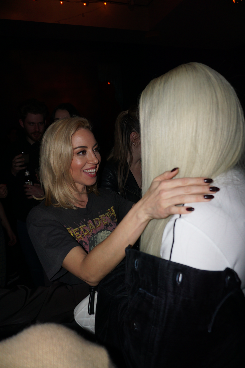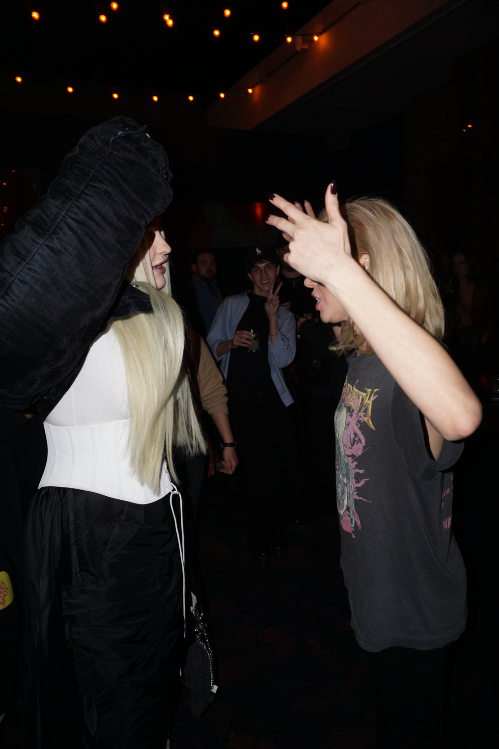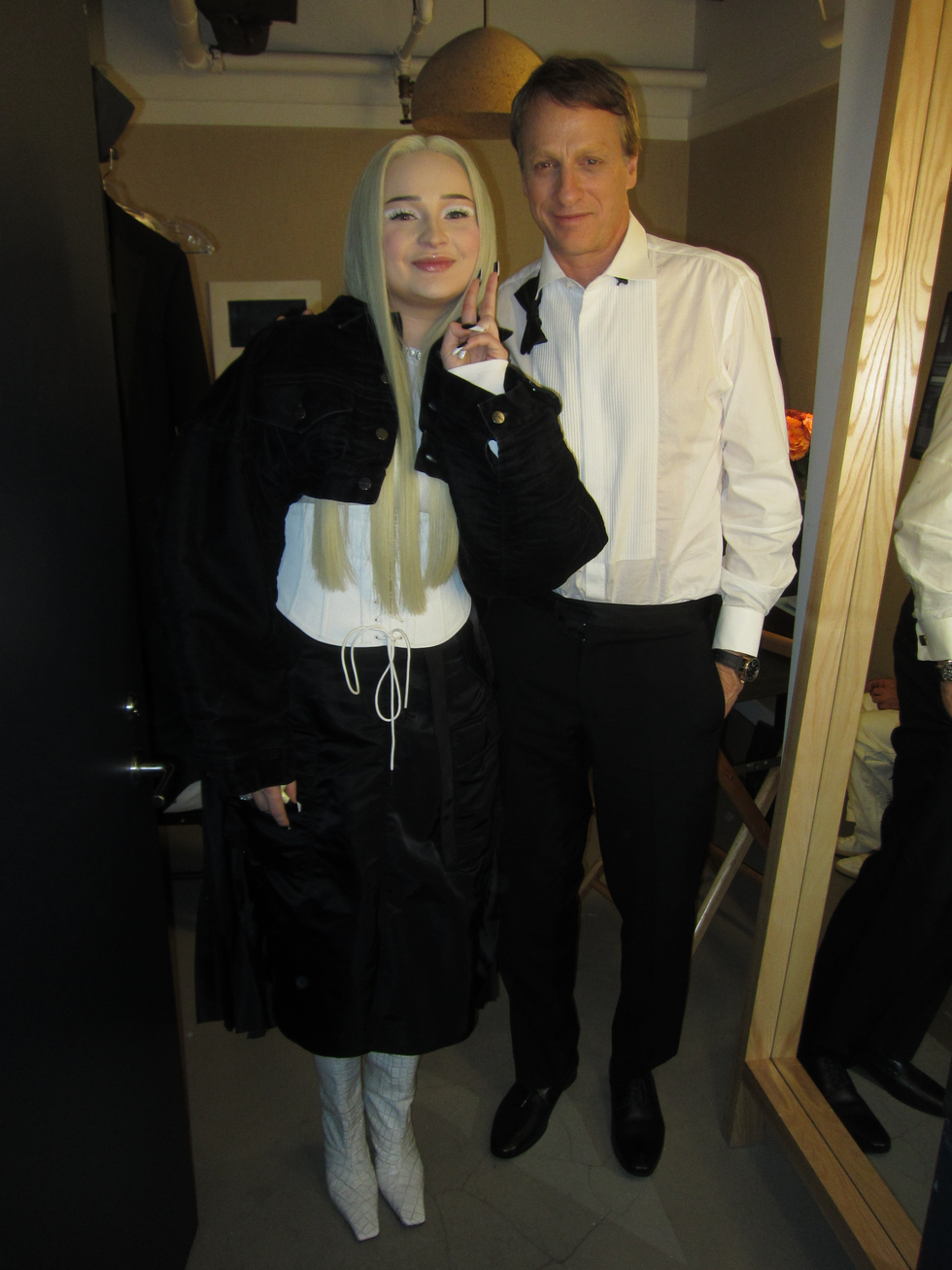 At the SNL after party, show guests and their plus-ones crowd into the back of Manhattan’s Rosa Mexicano, sipping margaritas and gushing over Sharon Stone’s iconic surprise cameo during a dramatic performance of Smith’s song “Gloria.” Smith towers over the crowd in a pair of impossibly high platforms and asks how late Flaming Saddles Saloon is open until (4 AM), joined by their new boyfriend, fashion designer Christian Cowan. Elsewhere, there’s skate legend Tony Hawk and host Aubrey Plaza, wearing a Megadeth t-shirt and bottle-blonde hair.
