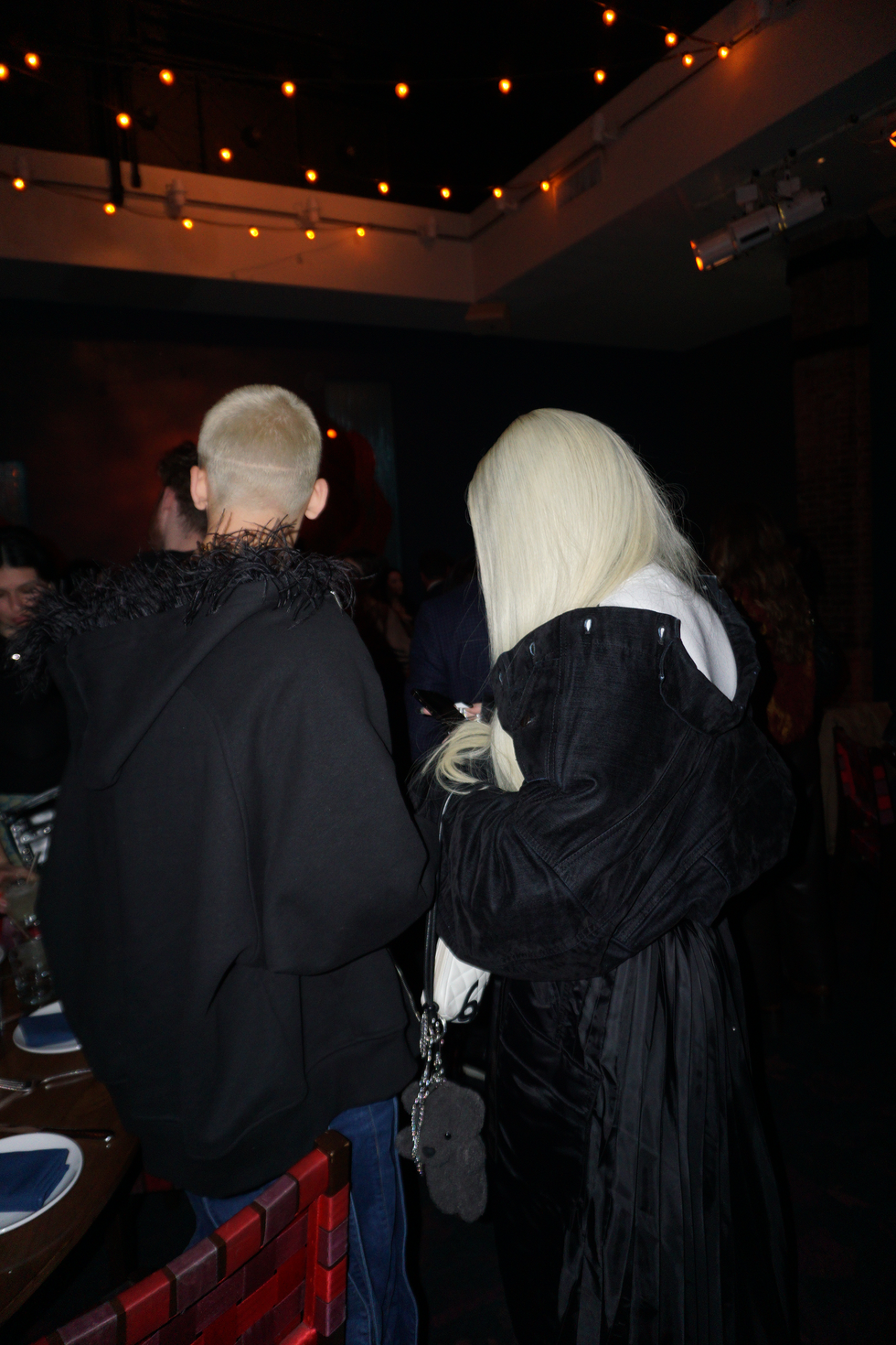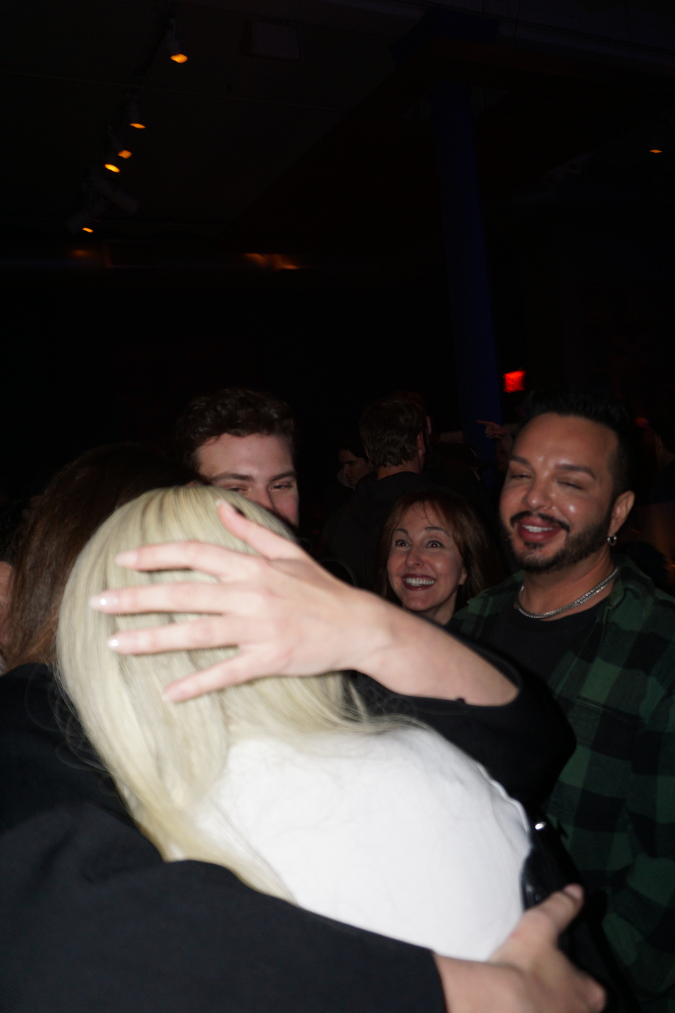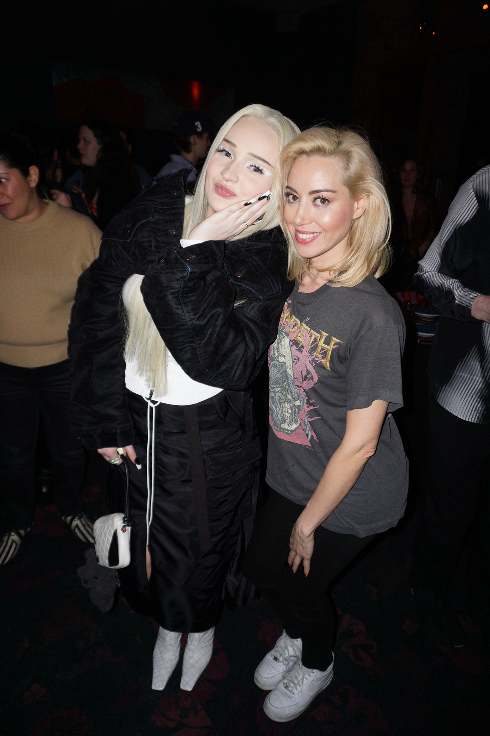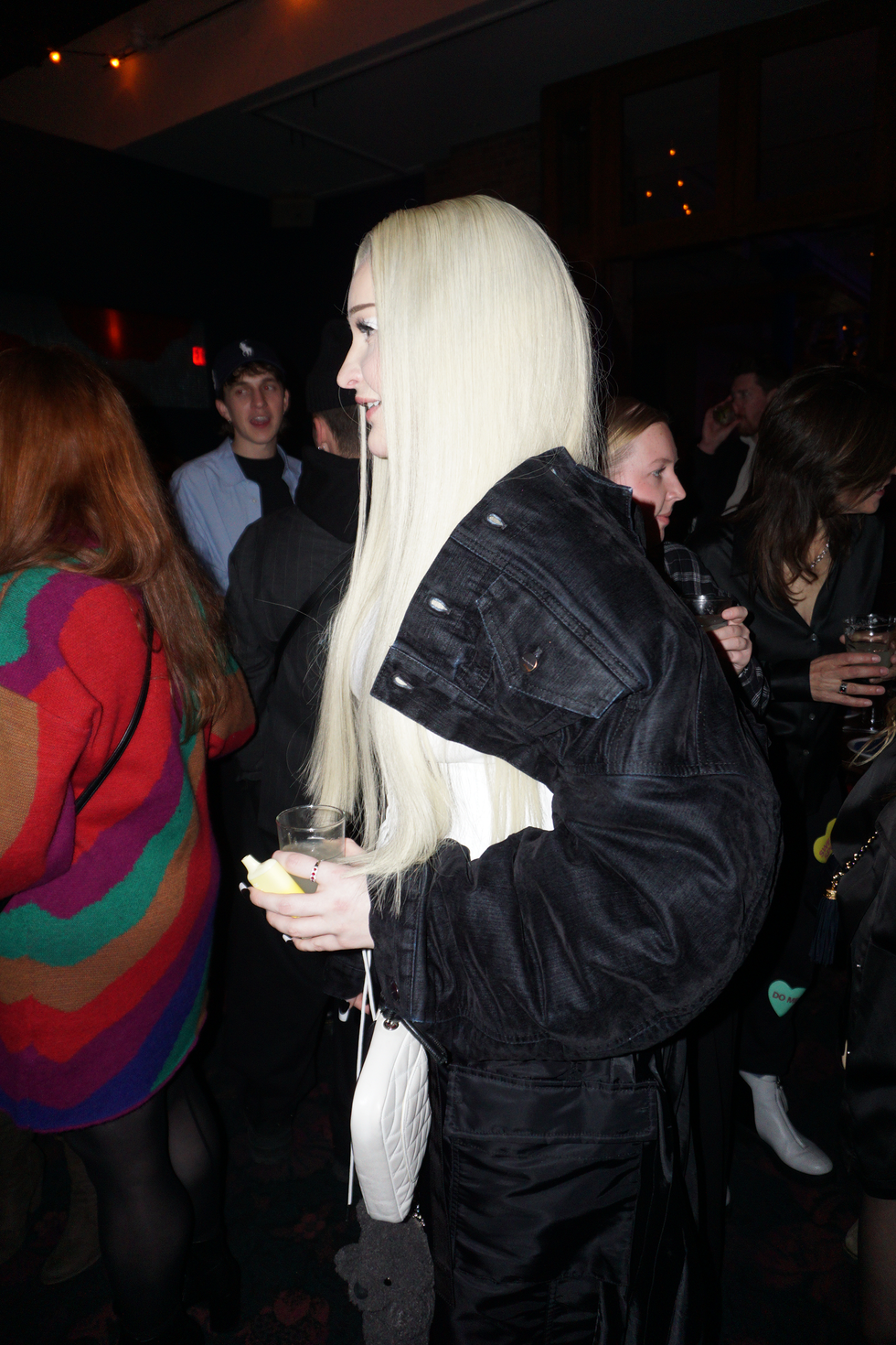 At the SNL after party, show guests and their plus-ones crowd into the back of Manhattan’s Rosa Mexicano, sipping margaritas and gushing over Sharon Stone’s iconic surprise cameo during a dramatic performance of Smith’s song “Gloria.” Smith towers over the crowd in a pair of impossibly high platforms and asks how late Flaming Saddles Saloon is open until (4 AM), joined by their new boyfriend, fashion designer Christian Cowan. Elsewhere, there’s skate legend Tony Hawk and host Aubrey Plaza, wearing a Megadeth t-shirt and bottle-blonde hair.